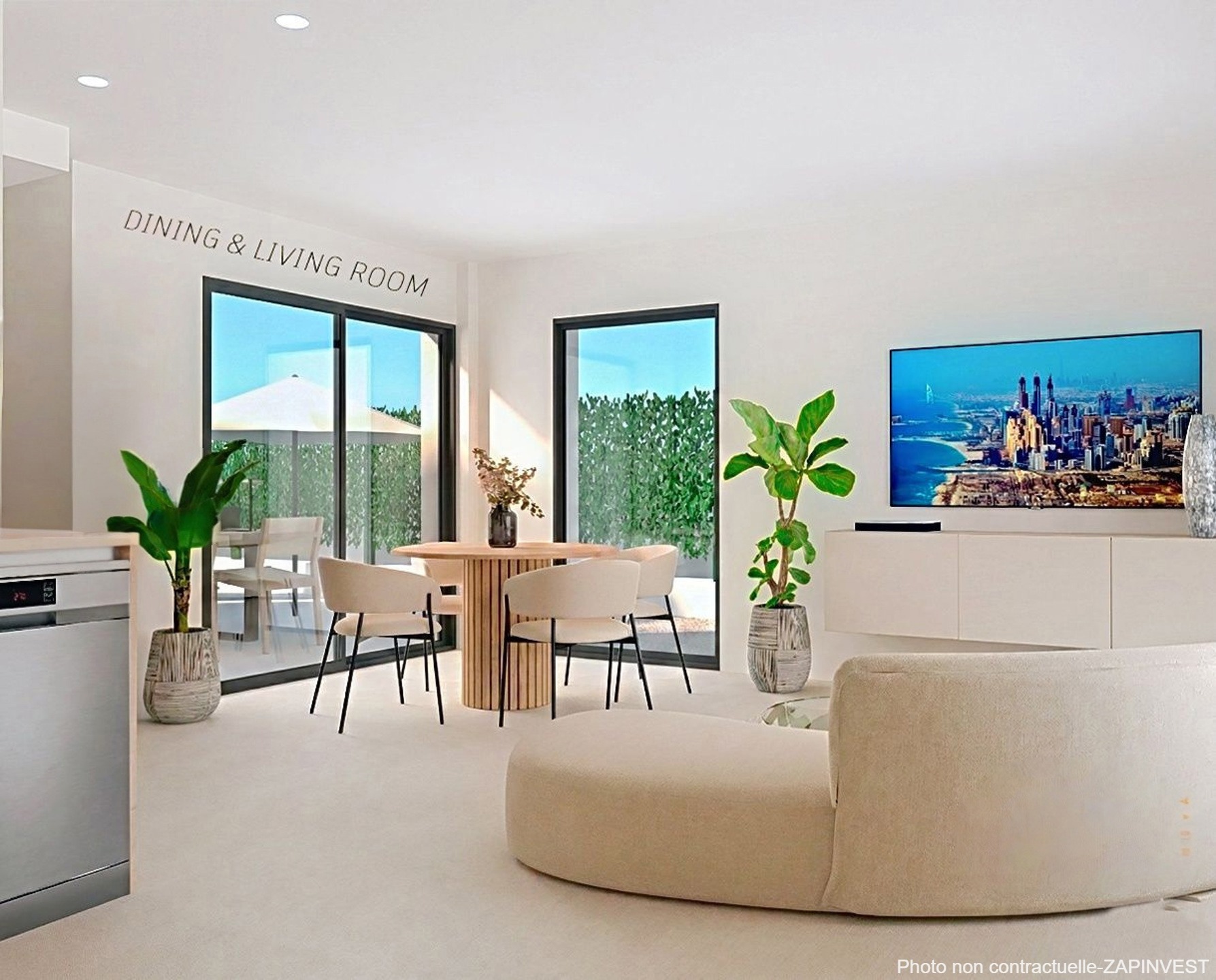 Au rez-de-chaussée, un grand salon-salle à manger avec cuisine ouverte, offre un aspect lumineux grâce à son design contemporain et donne directement sur le jardin avec une place parking privée sur la parcelle.