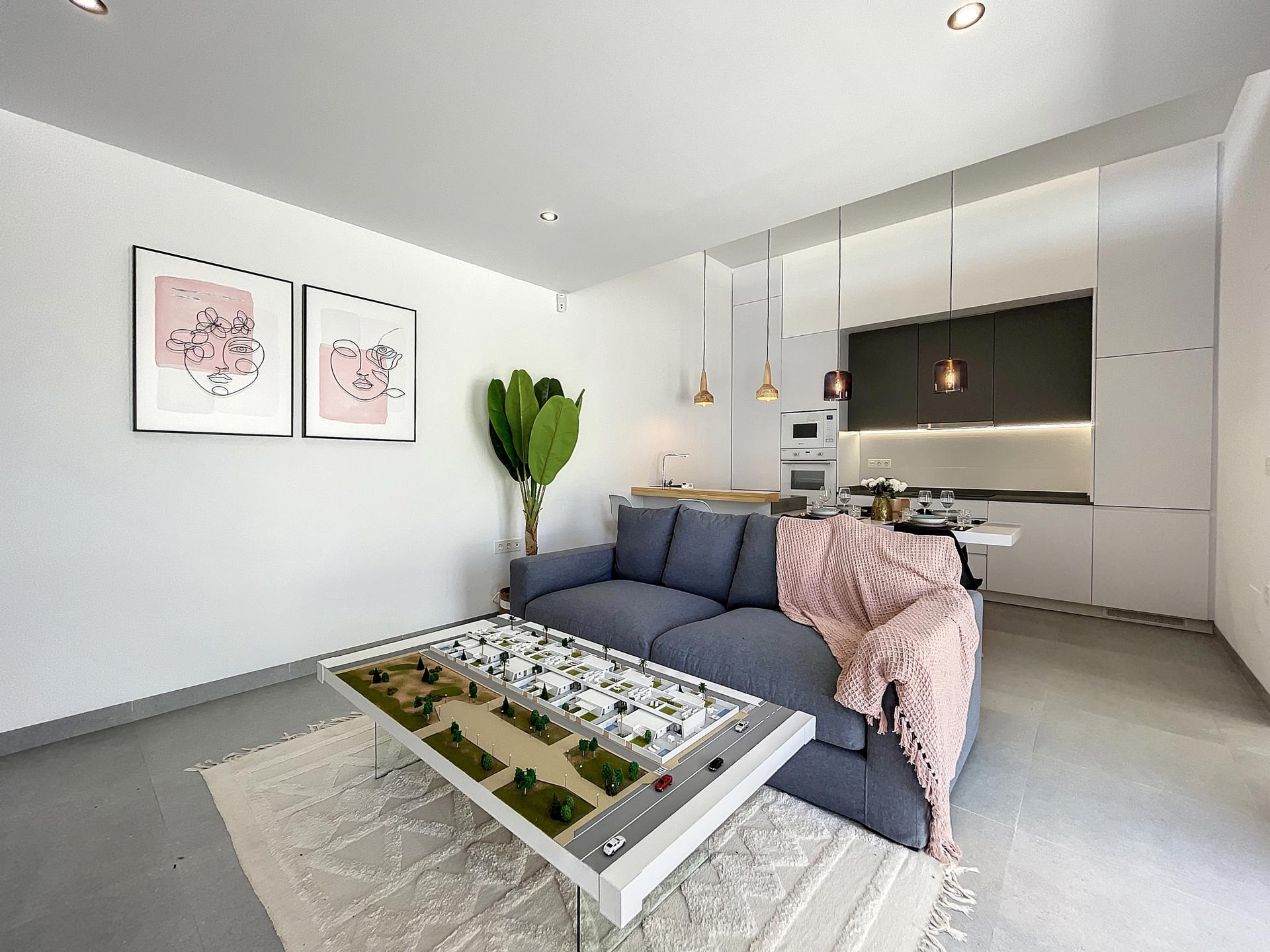 Cette villa de 3 chambres et 2 salles de bains offre une atmosphère moderne et spacieuse avec un haut plafond voûté, une cuisine et un salon ouvert.