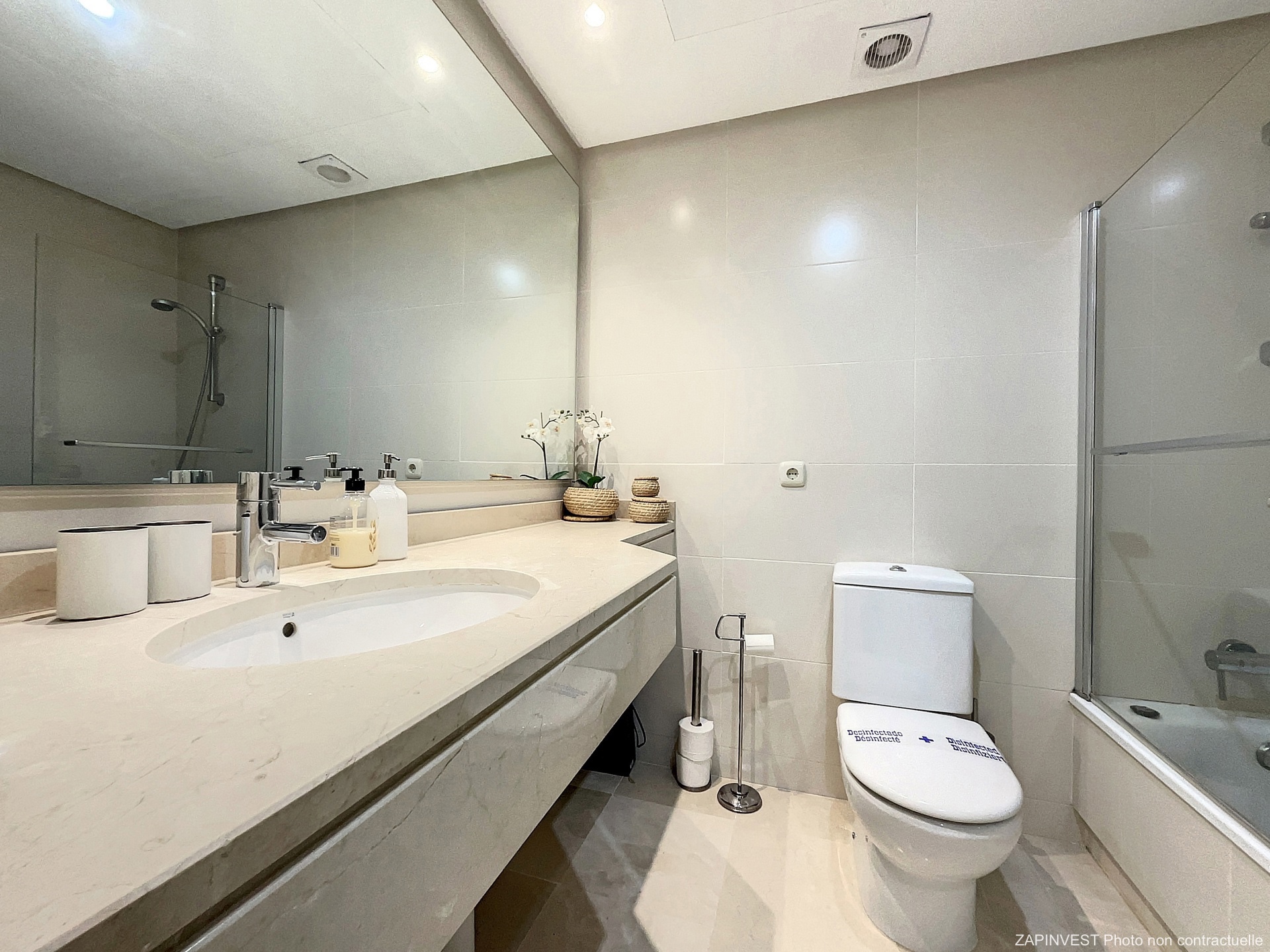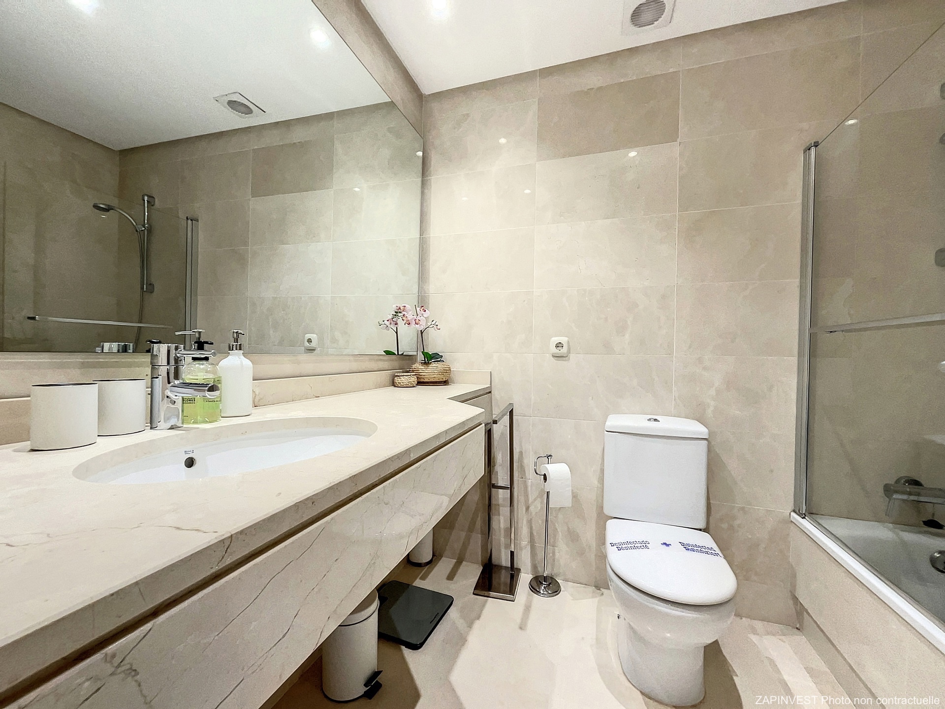 Il se compose de 2 chambres, 2 salles de bain et d’un bel espace de vie avec cuisine entièrement équipée. Finitions de qualité : sols en marbre, double vitrage, luminosité optimale.