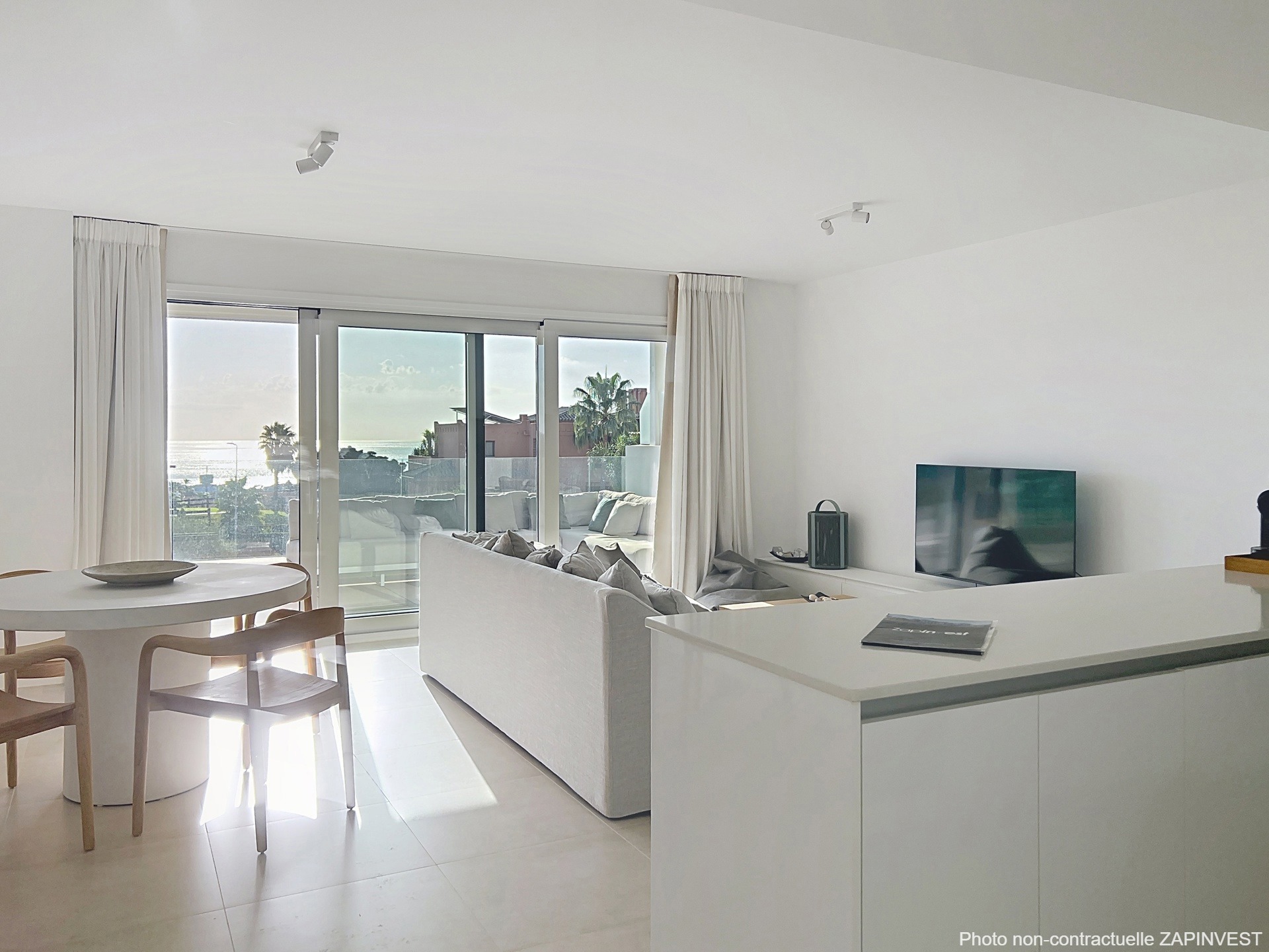 La cuisine ouverte et totalement équipée. L'appartement est vendu meublé, une place de parking privé et une cave au sous-sol sont également inclus dans le prix.