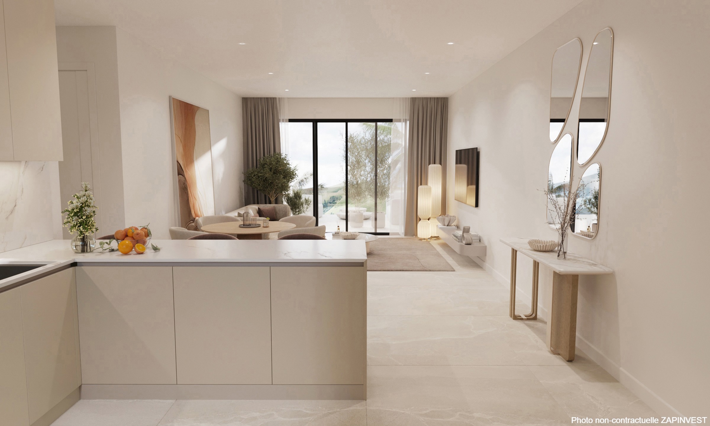 Magnifique nouveau complexe de 3 étages situé dans une zone de développement résidentiel. Les appartements ont une vue sur la mer, le golf et les montagnes. Chaque appartement bénéficie de son parking et de sa cave. La chambre parentale a sa salle de bains ensuite. La cuisine est entièrement meublée et équipée d'appareils électroménagers haut de gamme de marques européennes. Les plans de travail en céramique offrent une surface durable et facile à nettoyer, parfaite pour la préparation des repas et les réunions de famille.