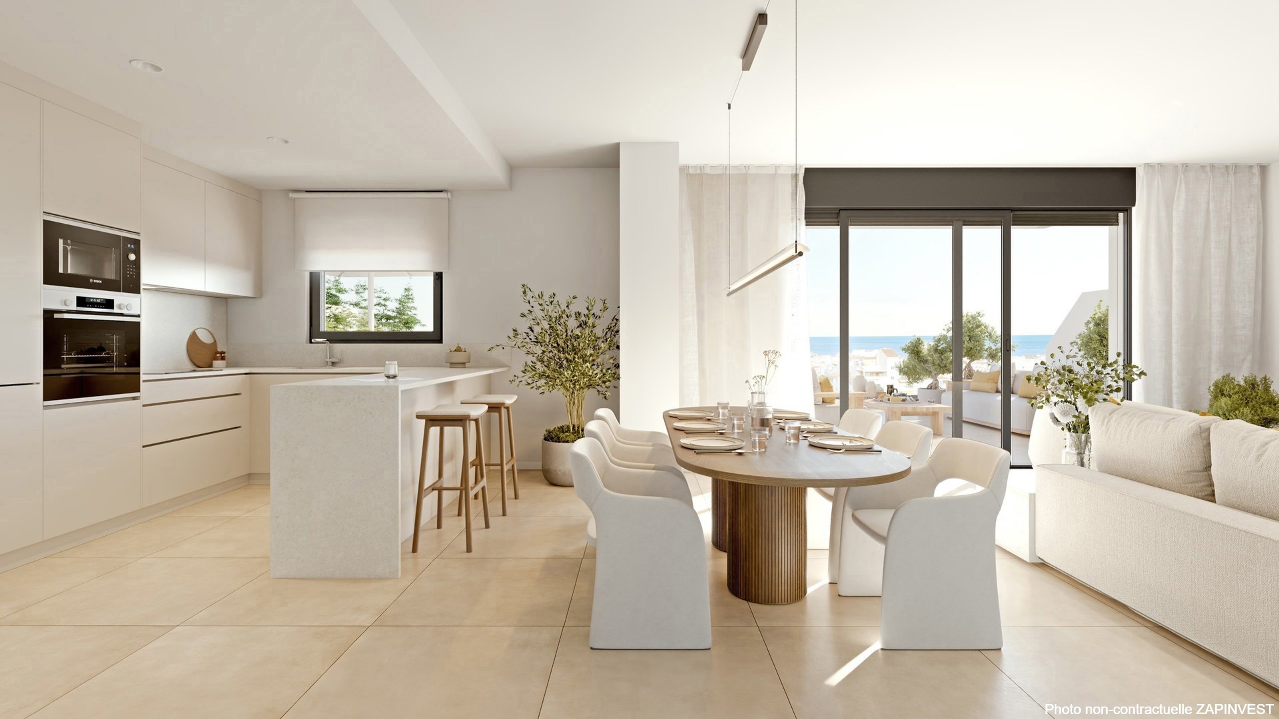 Ce magnifique appartement de 2 chambres et 2 salles de bains se décline très agréablement tout en largeur par une entrée offrant une vue directement sur le salon et la salle à manger, prolongé par la spacieuse terrasse. A main droite de l'entrée, une cuisine ouverte, entièrement équipée (frigo/congélateur, lave-vaisselle, hotte électrique, four électrique, plaque à induction), le lave-linge est installé dans la buanderie.