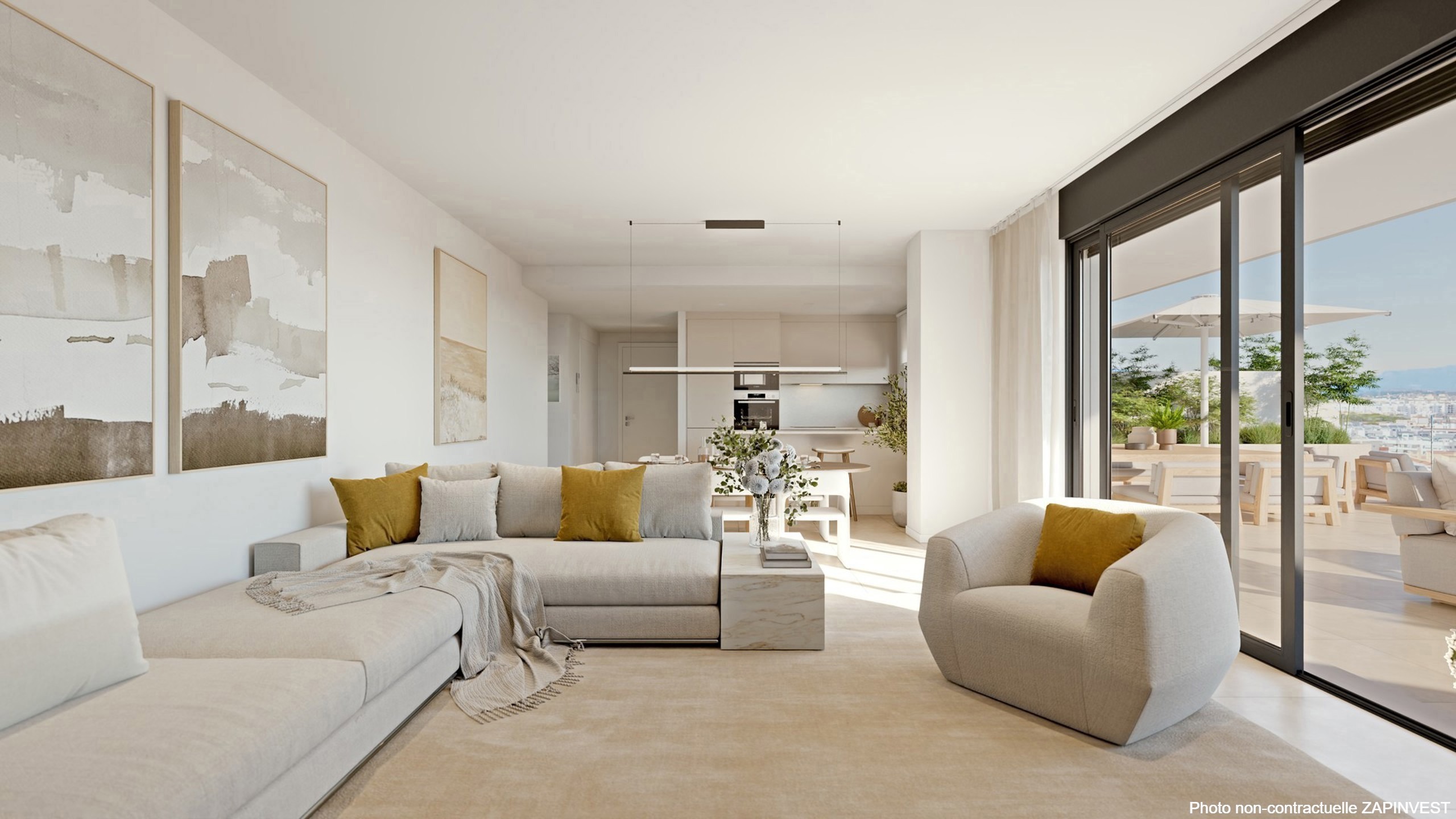Ce magnifique appartement de 2 chambres et 2 salles de bains se décline très agréablement tout en largeur par une entrée offrant une vue directement sur le salon et la salle à manger, prolongé par la spacieuse terrasse. A main droite de l'entrée, une cuisine ouverte, entièrement équipée (frigo/congé...