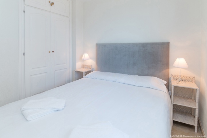 L’appartement, situé au cinquième étage, se compose de deux chambres et deux salles de bains. Sa terrasse orientée plein sud bénéficie d’une vue imprenable sur la mer, l’une des piscines et les jardins paysagers. Il dispose également d’une cuisine entièrement équipée et entièrement rénovée, d’un système de climatisation réversible, d’une place de stationnement en sous-sol et il est vendu meublé.