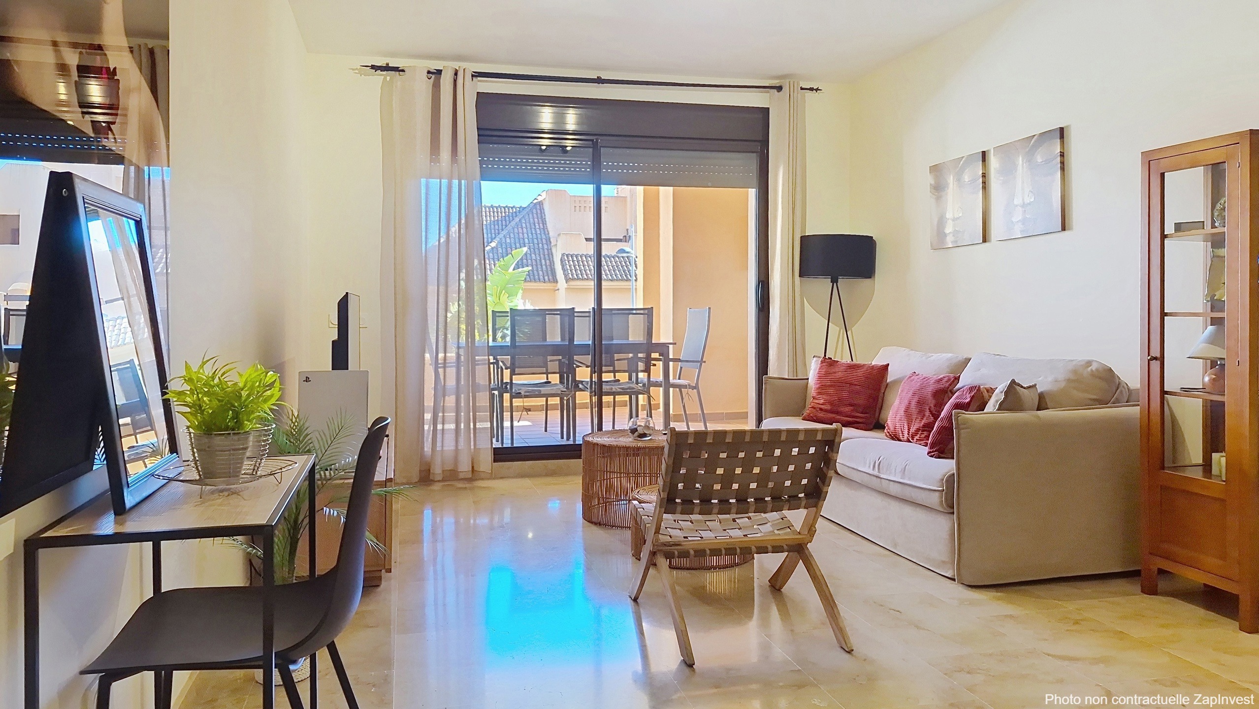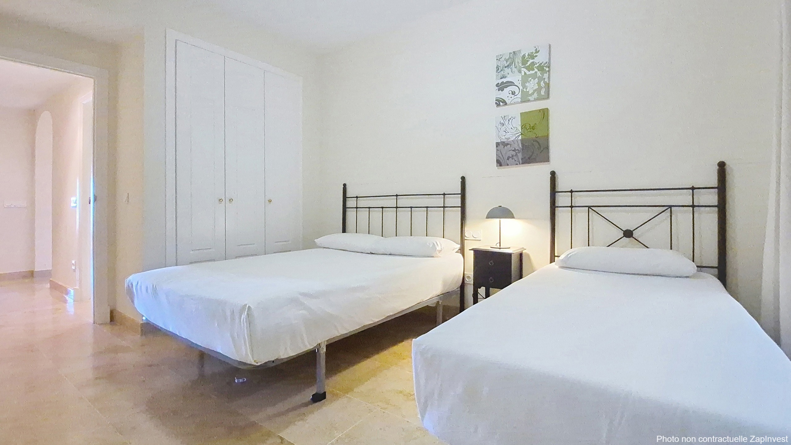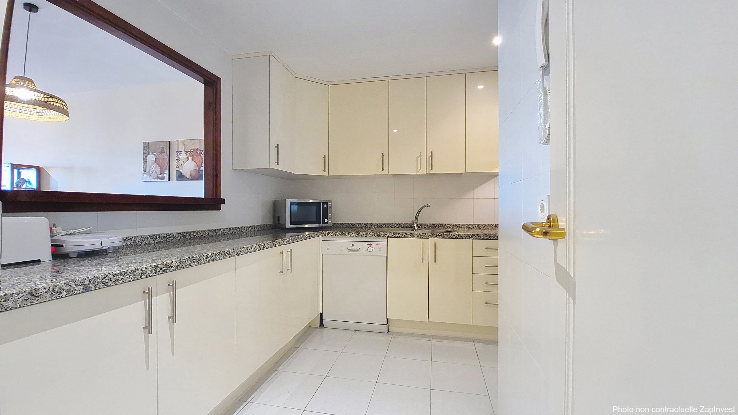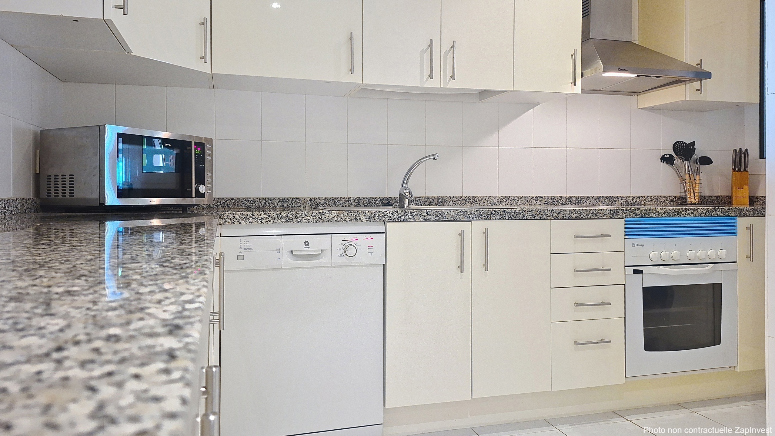 La chambre principale possède une salle de bain en suite et un accès direct à la magnifique terrasse. La seconde chambre donne sur les espaces verts de l’urbanisation. Vous trouverez également une salle de bain pour les invités, une buanderie fonctionnelle et une cuisine avec fenêtre ouverte sur un vaste séjour lumineux.