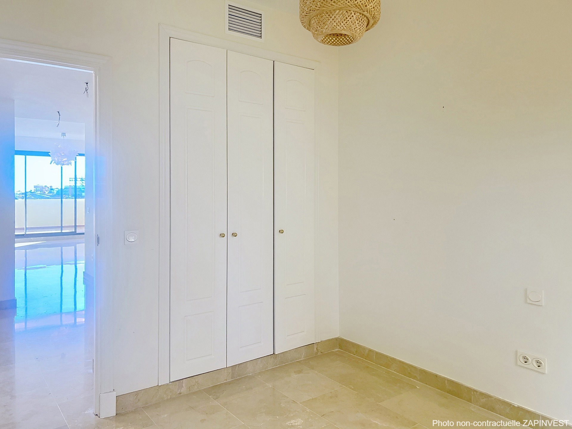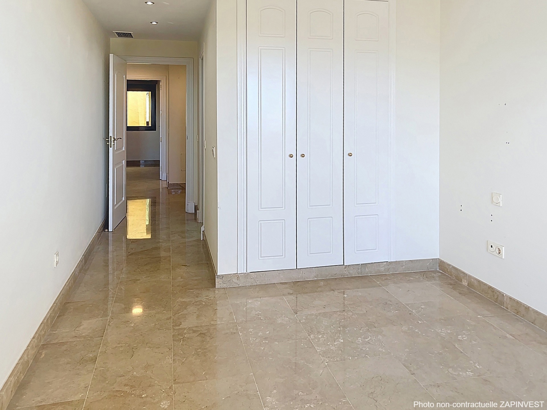 La suite principale dispose de sa propre salle de bain et d’un accès direct à la terrasse avec de magnifiques vues sur la mer et le golf. La seconde chambre, orientée vers les jardins verdoyants de la résidence, est complétée par une salle de bain pour les invités.