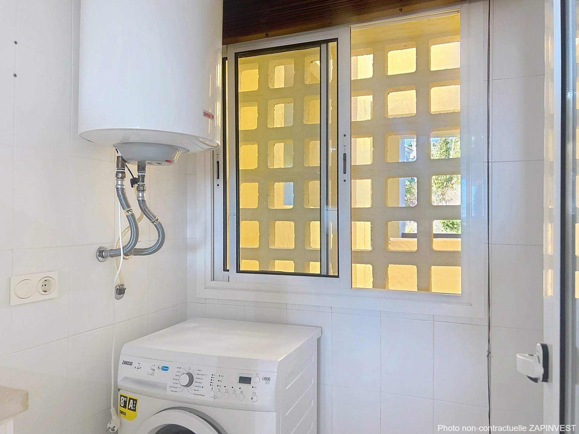 La cuisine est entièrement équipée, dotée d’une fenêtre donnant sur le salon, vous donnant la possibilité de cuisiner tout en admirant la belle vue sur mer. La grande buanderie très fonctionnelle vous apporte un petit plus pour le rangement.