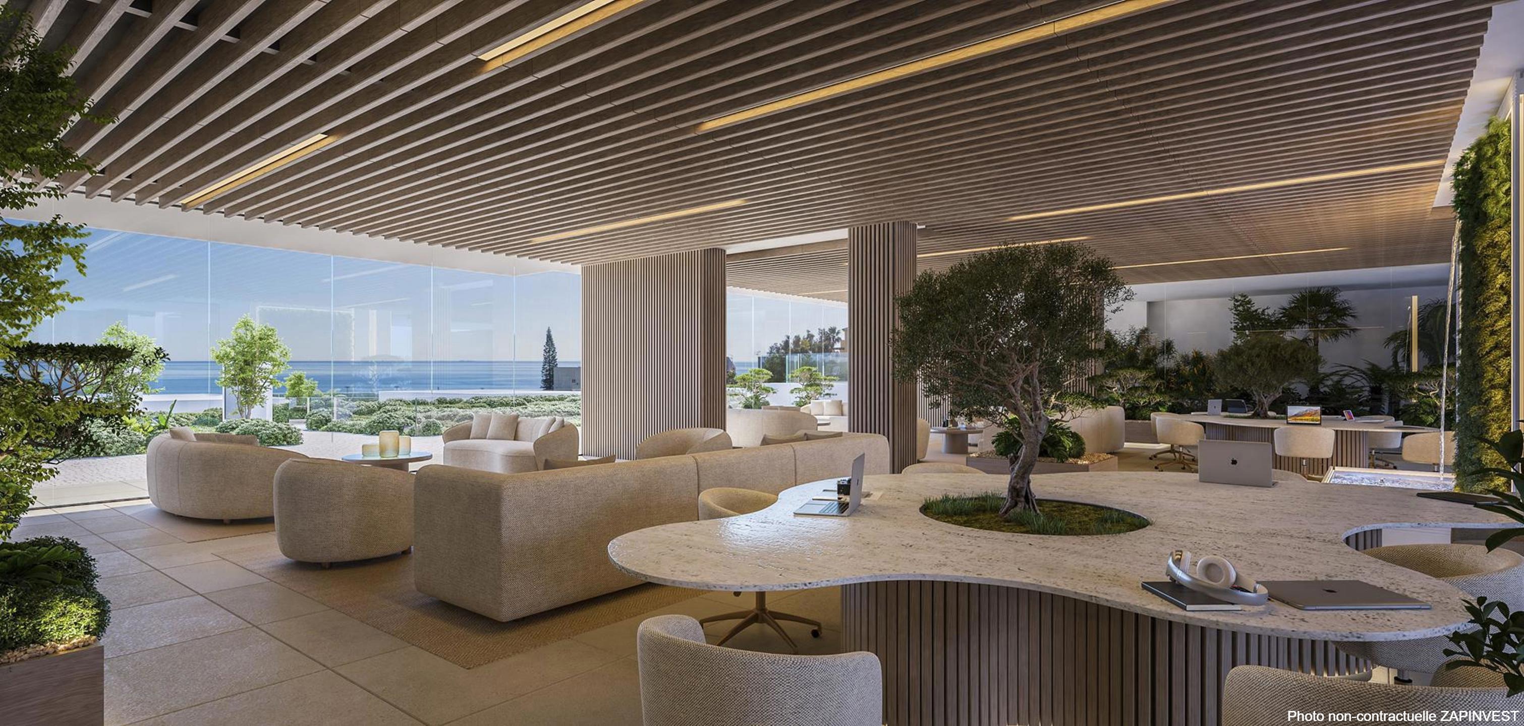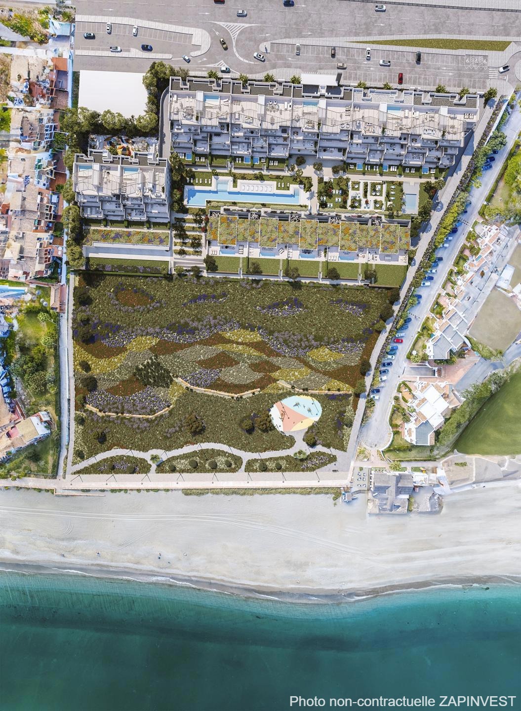 Le projet bénéficie d’un aménagement paysager complet comprenant 5 000m² de jardins privés à l’usage exclusif des résidents, ainsi qu’un vaste espace vert public de 13 500 m² situé entre le lotissement et le front de mer.