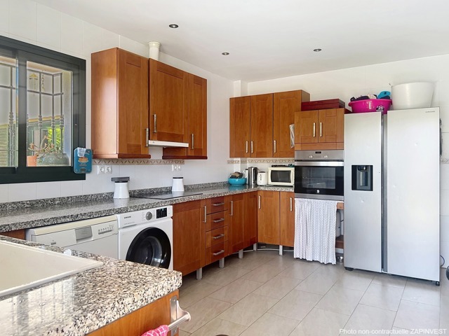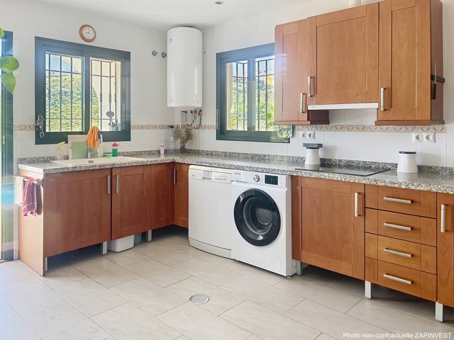 La cuisine est ample, entièrement équipée avec un accès direct à une terrasse extérieure, parfaite pour profiter du repas en plein air pendant l'été, au bord de la piscine. La pièce à l’arrière du salon peut être aménagée comme 4ème chambre, comme salle à manger ou comme bureau.