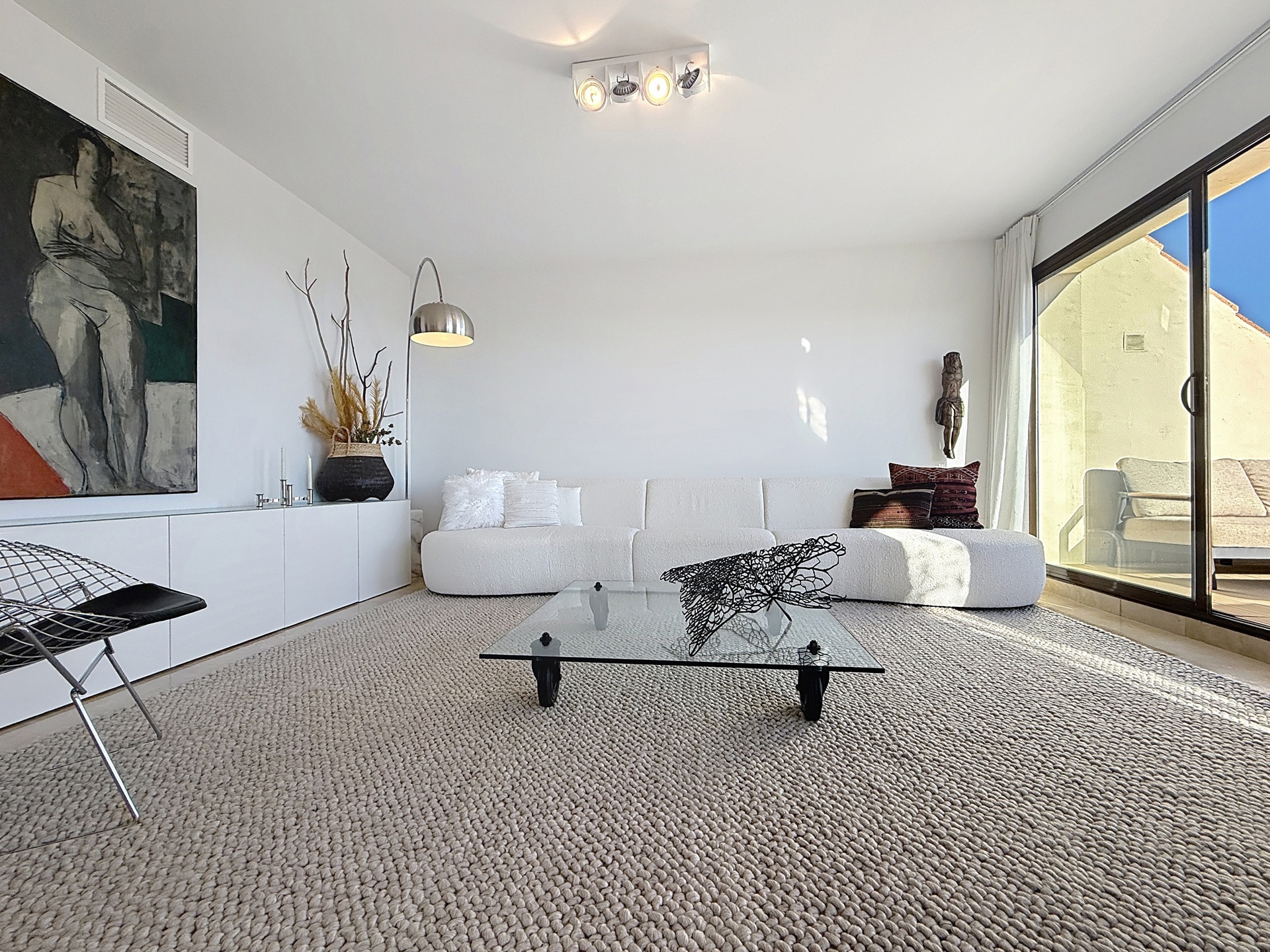 Dès l’entrée, la sensation d’espace et la clarté naturelle s’imposent, renforcées par une lucarne dans le hall, avec une première perspective ouverte sur la mer.