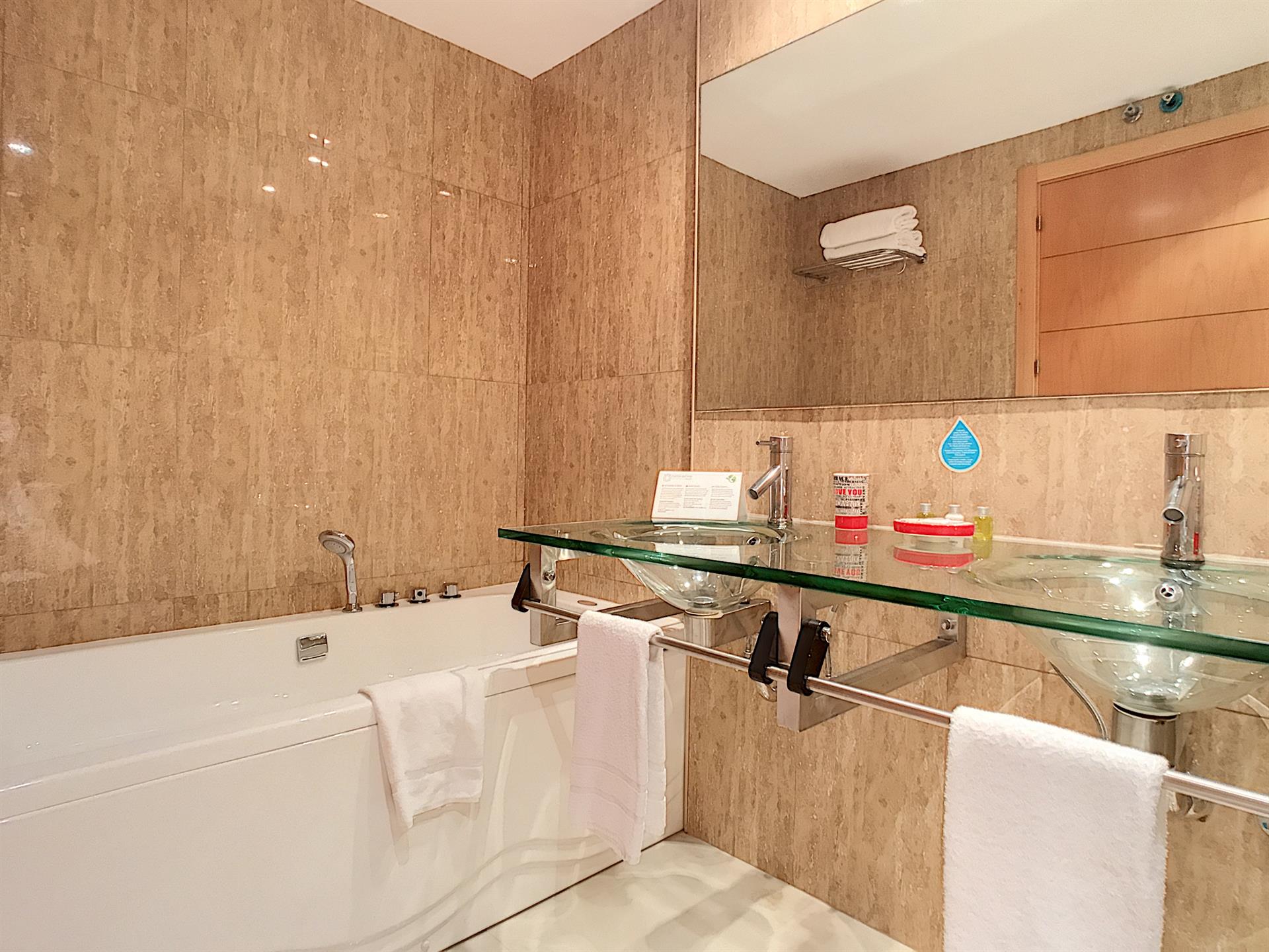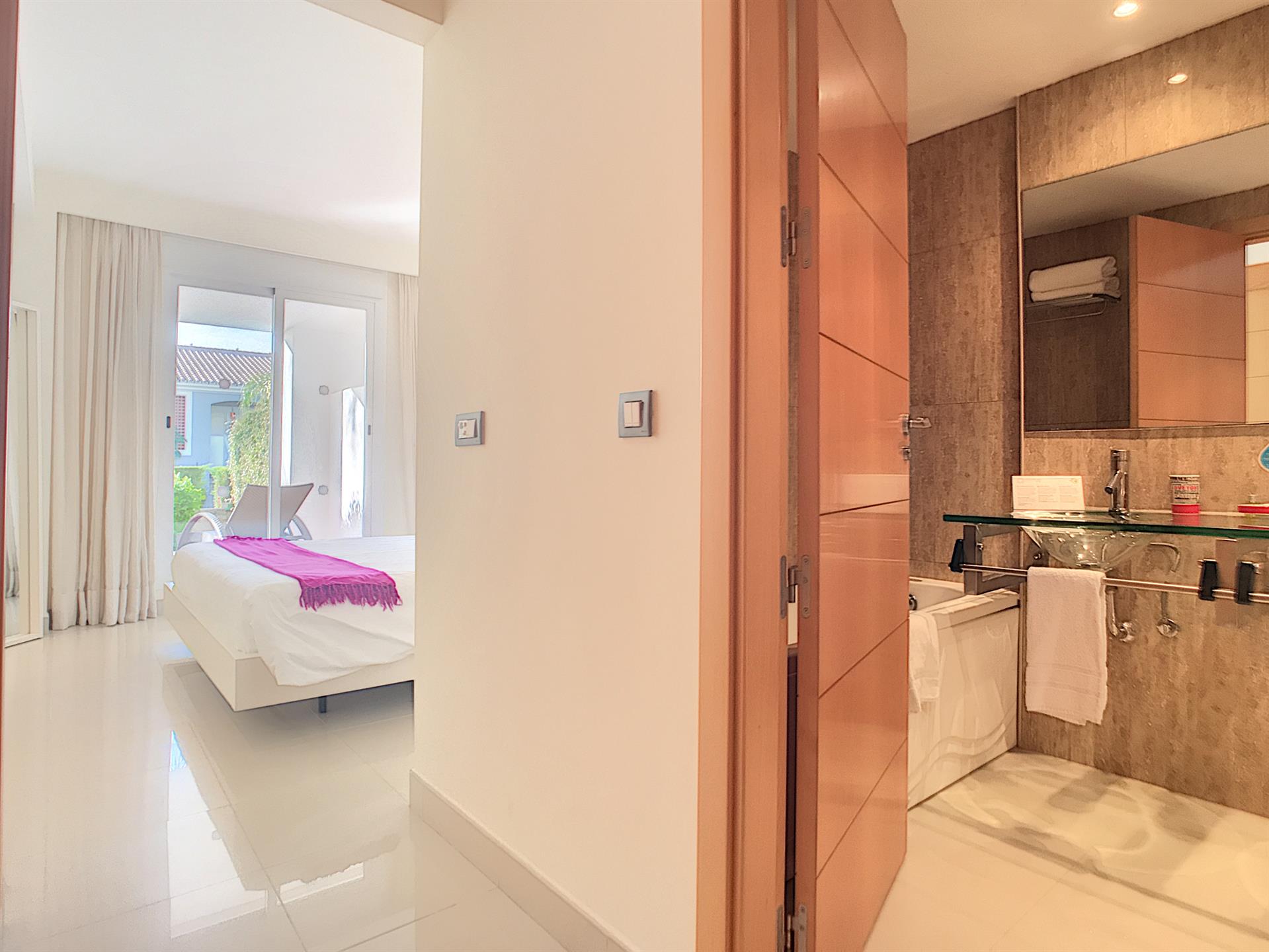 L’appartement se compose de deux chambres spacieuses et de deux salles de bain, dont une en suite. Vous serez séduit par son vaste et lumineux séjour ouvrant sur une belle terrasse de 32 m², prolongée par un jardin privatif de 28 m², soigneusement entretenu par le jardinier de la copropriété.