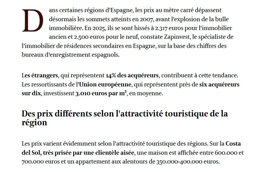 Dans un article récemment publié par le journal L’Echo, la rédaction revient sur la hausse continue des prix des résidences secondaires en Espagne et sur l’appétit intact des Belges pour ce marché. Pour décrypter la situation, le média a interrogé Jonathan Buchet, CEO de Zapinvest Belgium, afin d’analyser les tendances actuelles, les opportunités encore présentes et les risques éventuels d’une nouvelle bulle immobilière. Un éclairage particulièrement intéressant pour tous ceux qui envisagent d’acheter le bien de leurs rêves en Espagne.