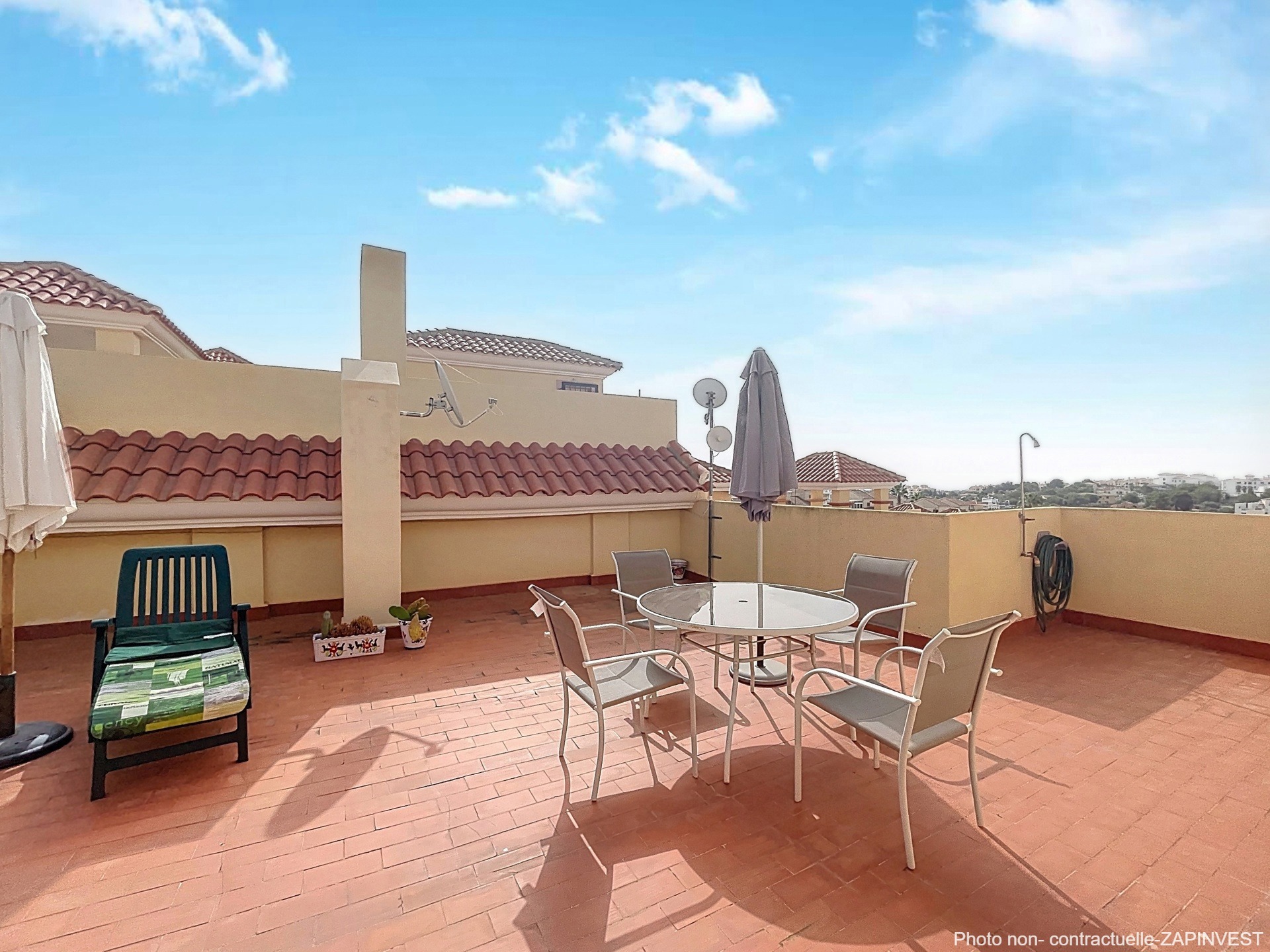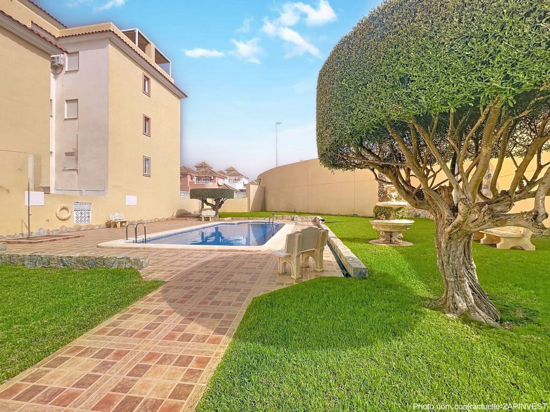 L'urbanisation ne possede pas d'ascenseur mais est sécurisée et très bien équipée de plusieurs piscines communes dont une, à proximité de l’immeuble, entourée de gazon naturel et d’Oliviers.