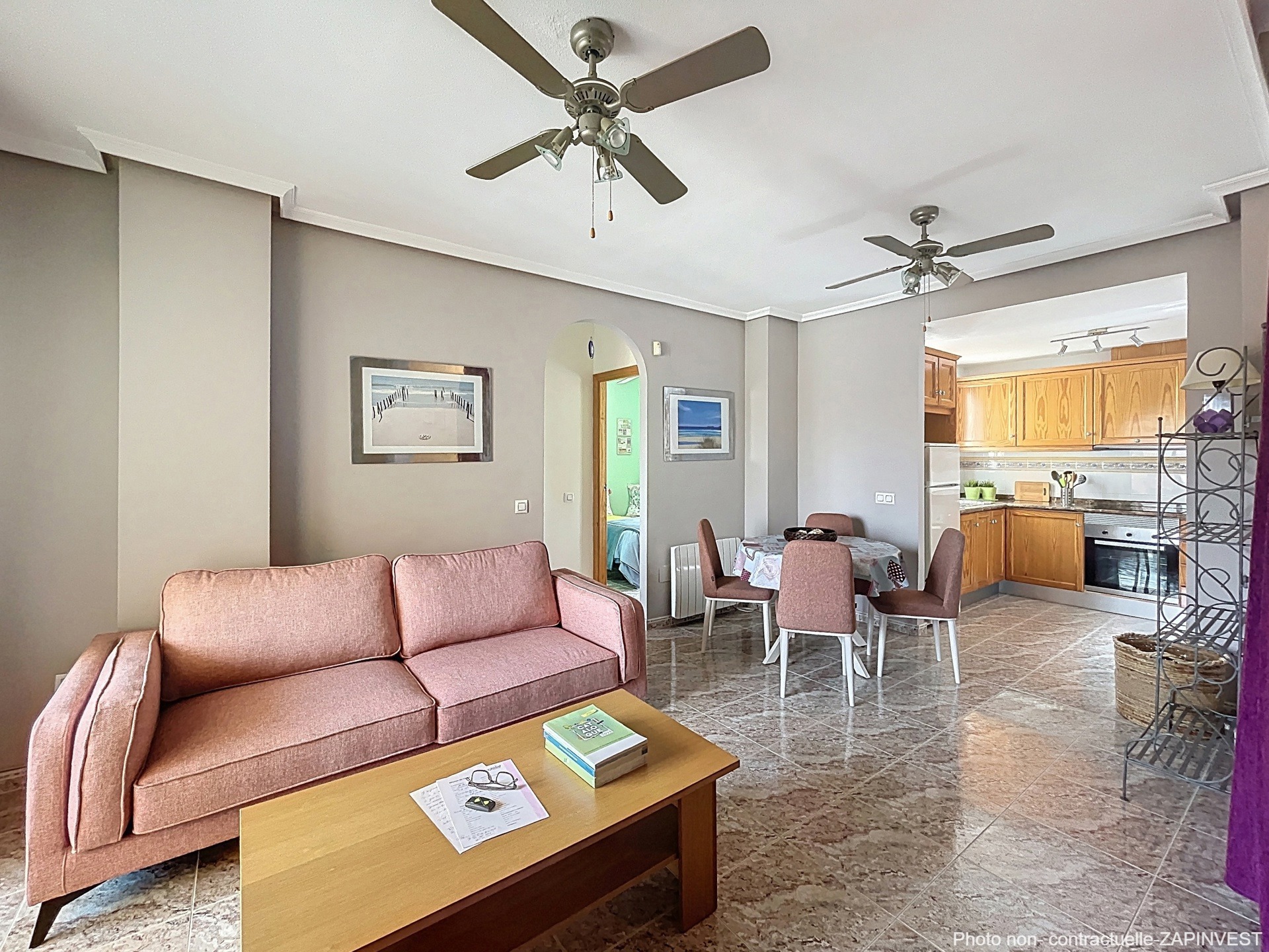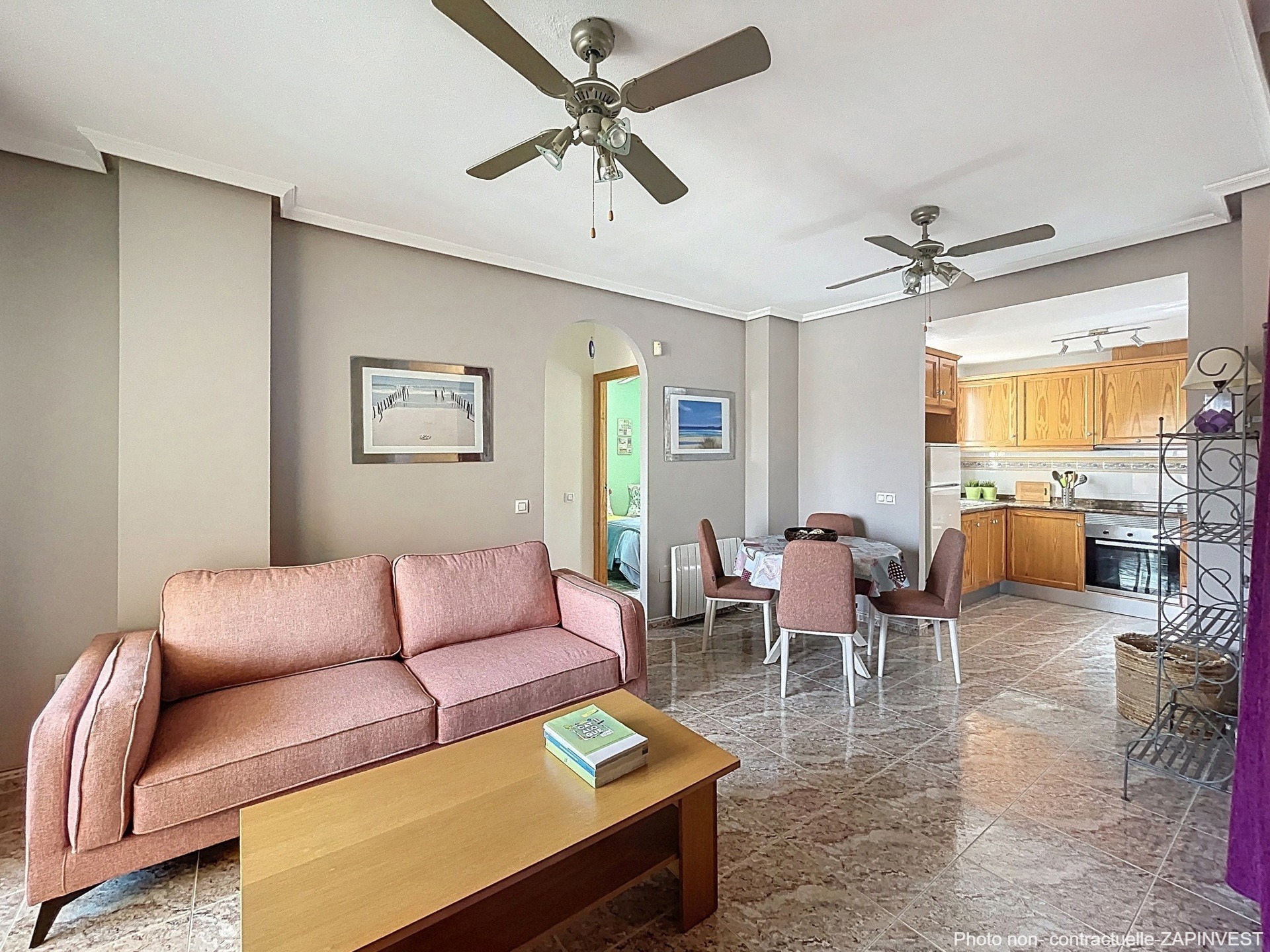 Sa cuisine s’ouvre sur un ample salon donnant sur une petite terrasse principale au niveau du salon.