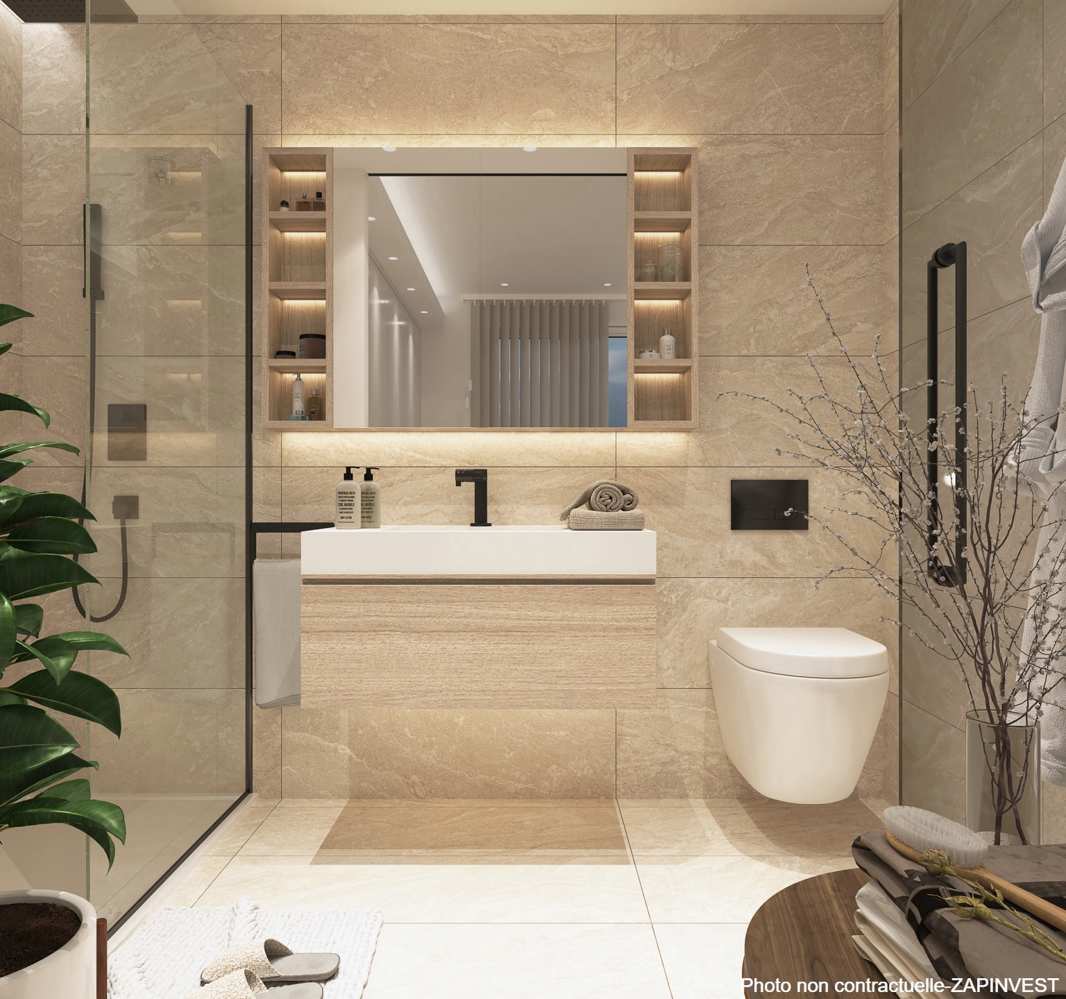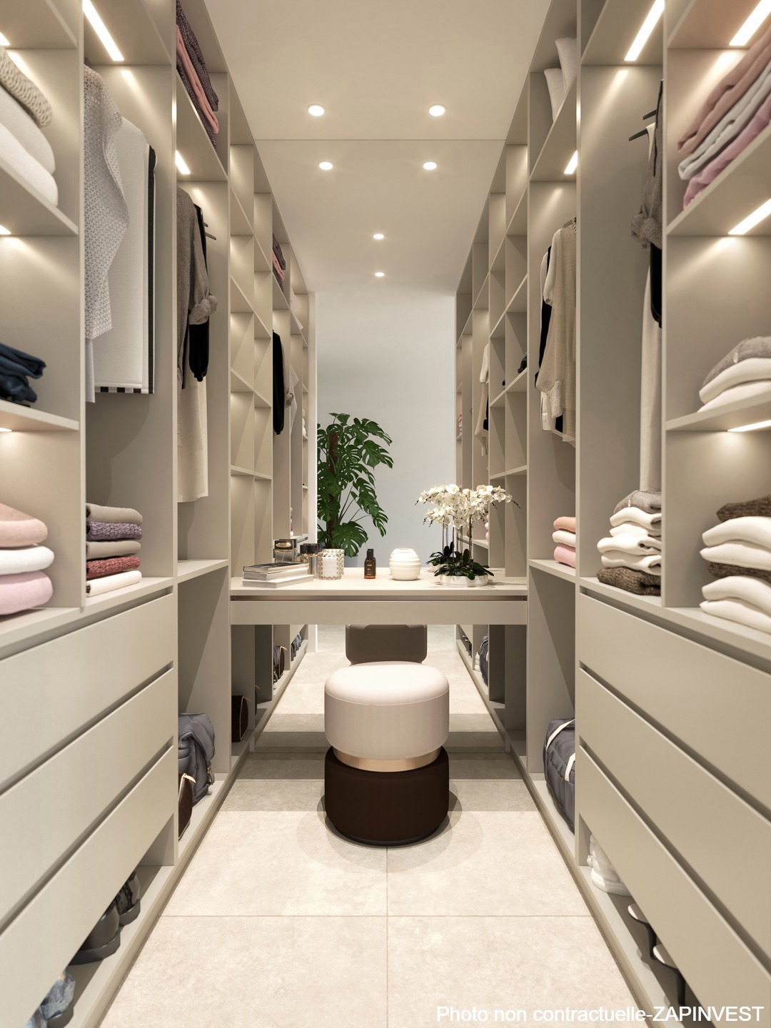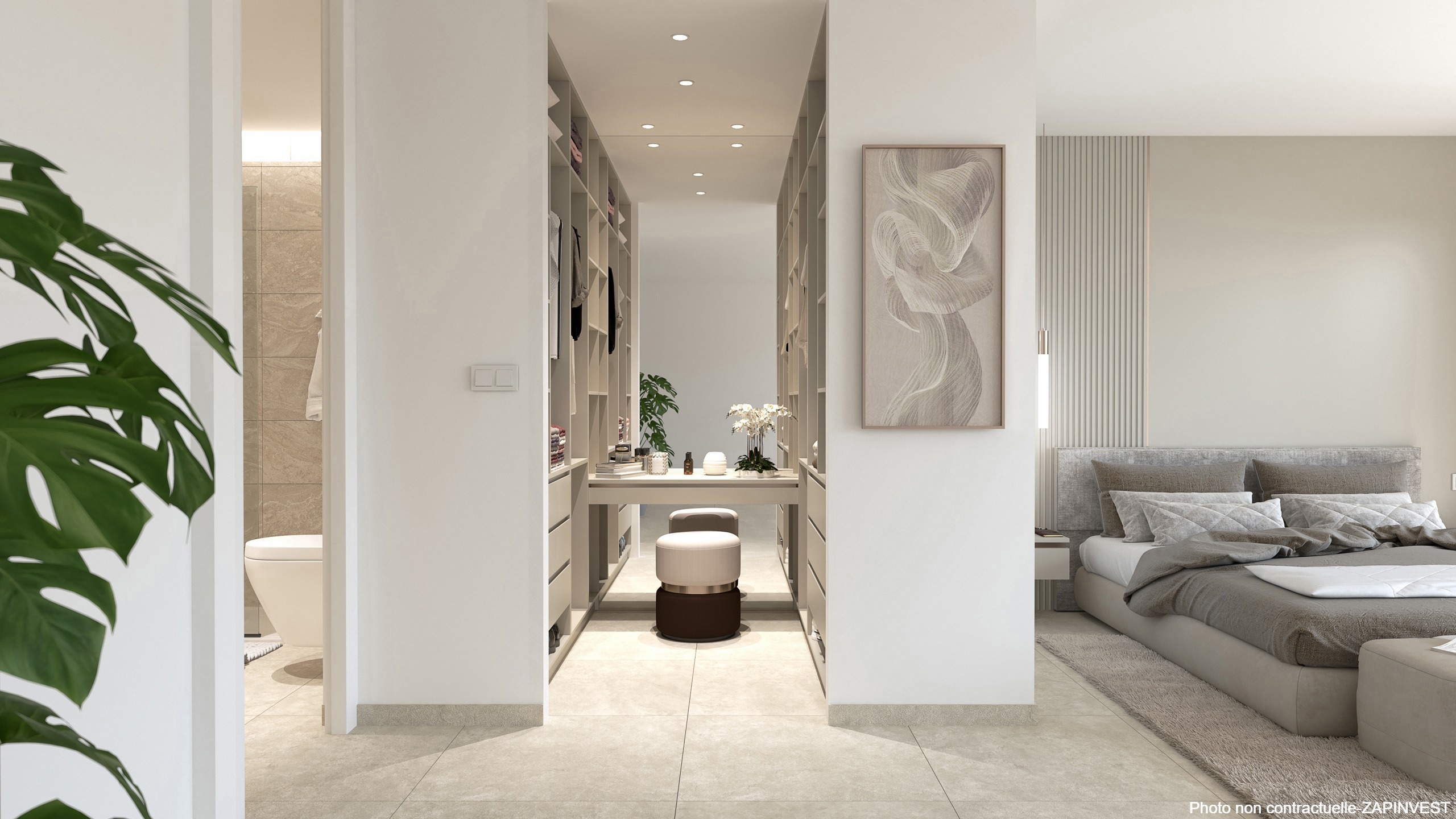 Tout le luxe intégré : cuisine entièrement équipée avec électroménagers, air conditionné, chauffage au sol dans les salles de bain, place de parking et cave.