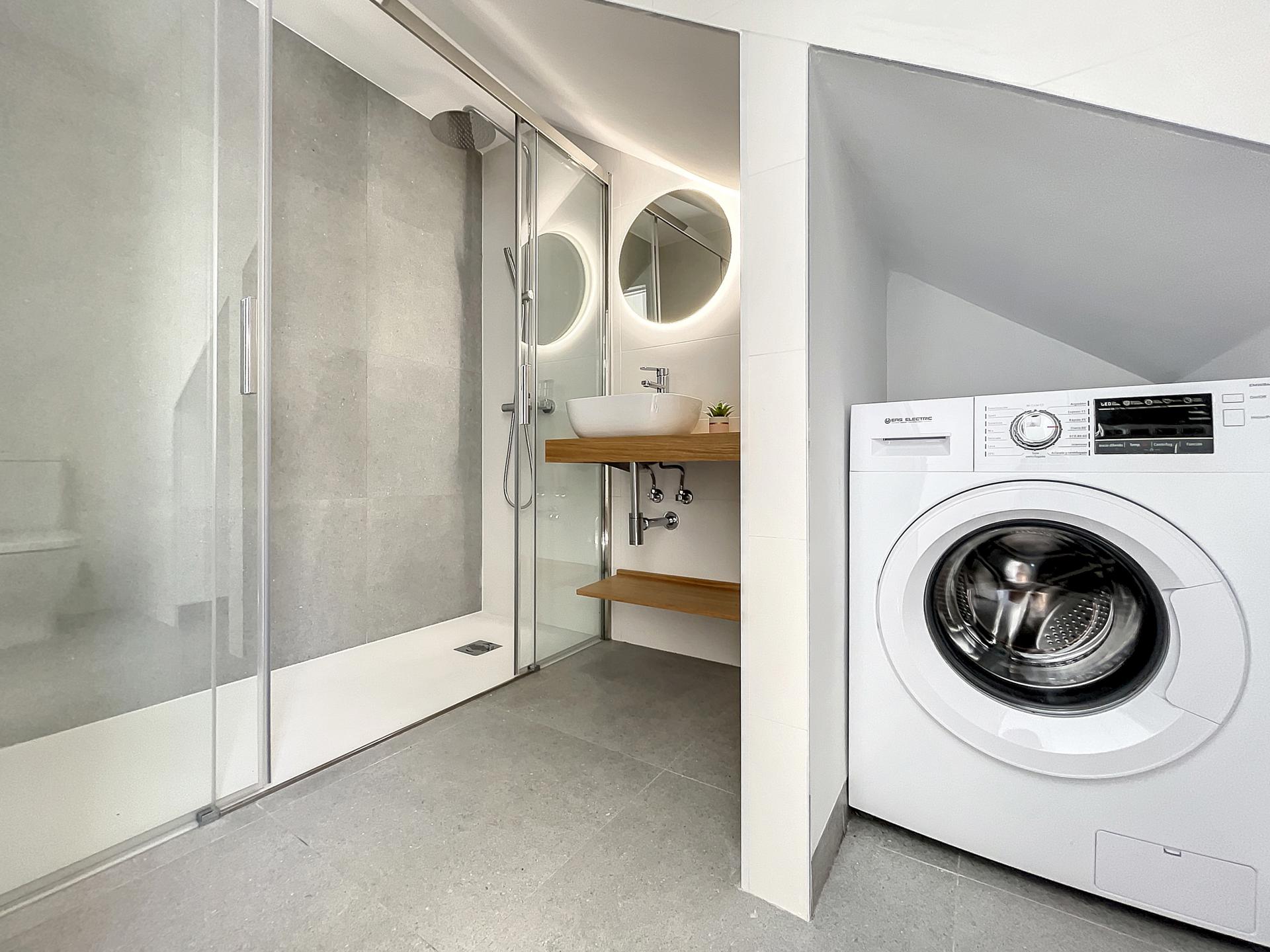 La cuisine est équipée de plaque à induction, four, micro-ondes intégré, lave-vaisselle intégré, réfrigérateur-congélateur intégré et lave-linge.