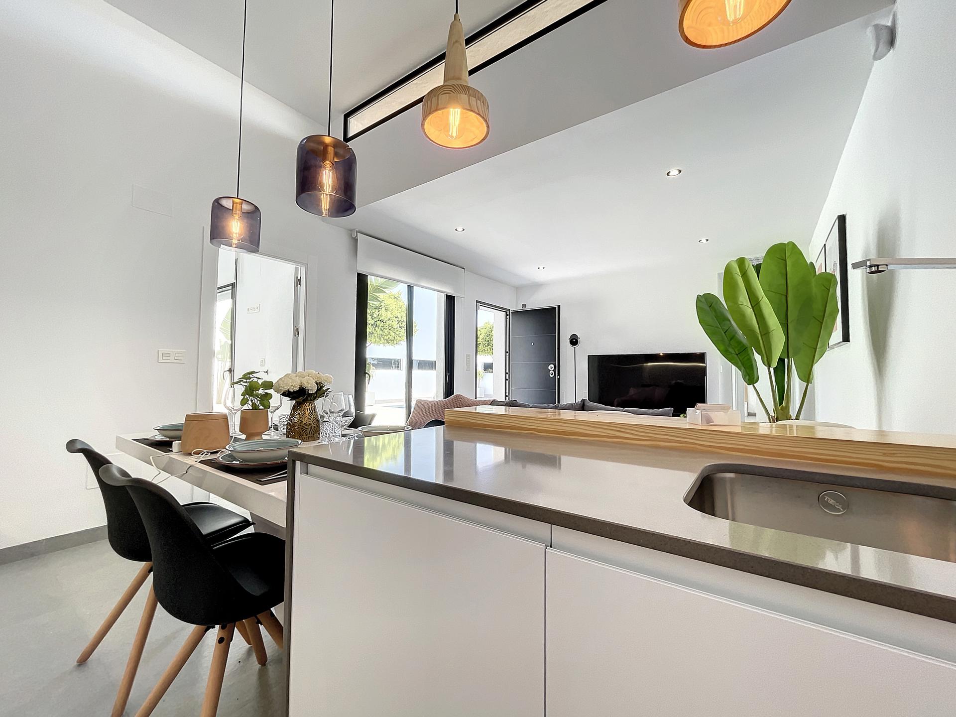 Cette villa de 3 chambres et 2 salles de bains offre une atmosphère moderne et spacieuse avec un haut plafond voûté, une cuisine et un salon ouvert.