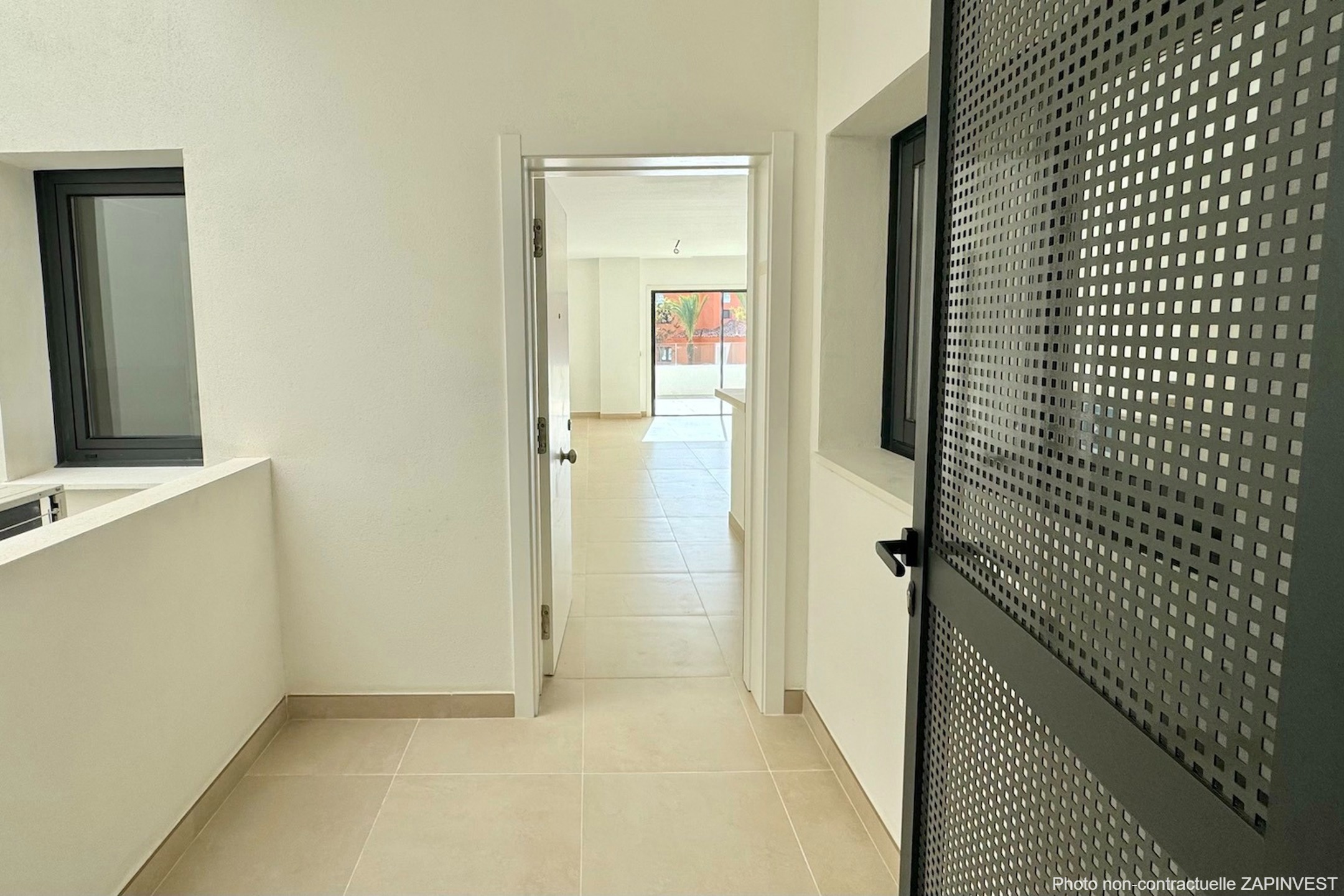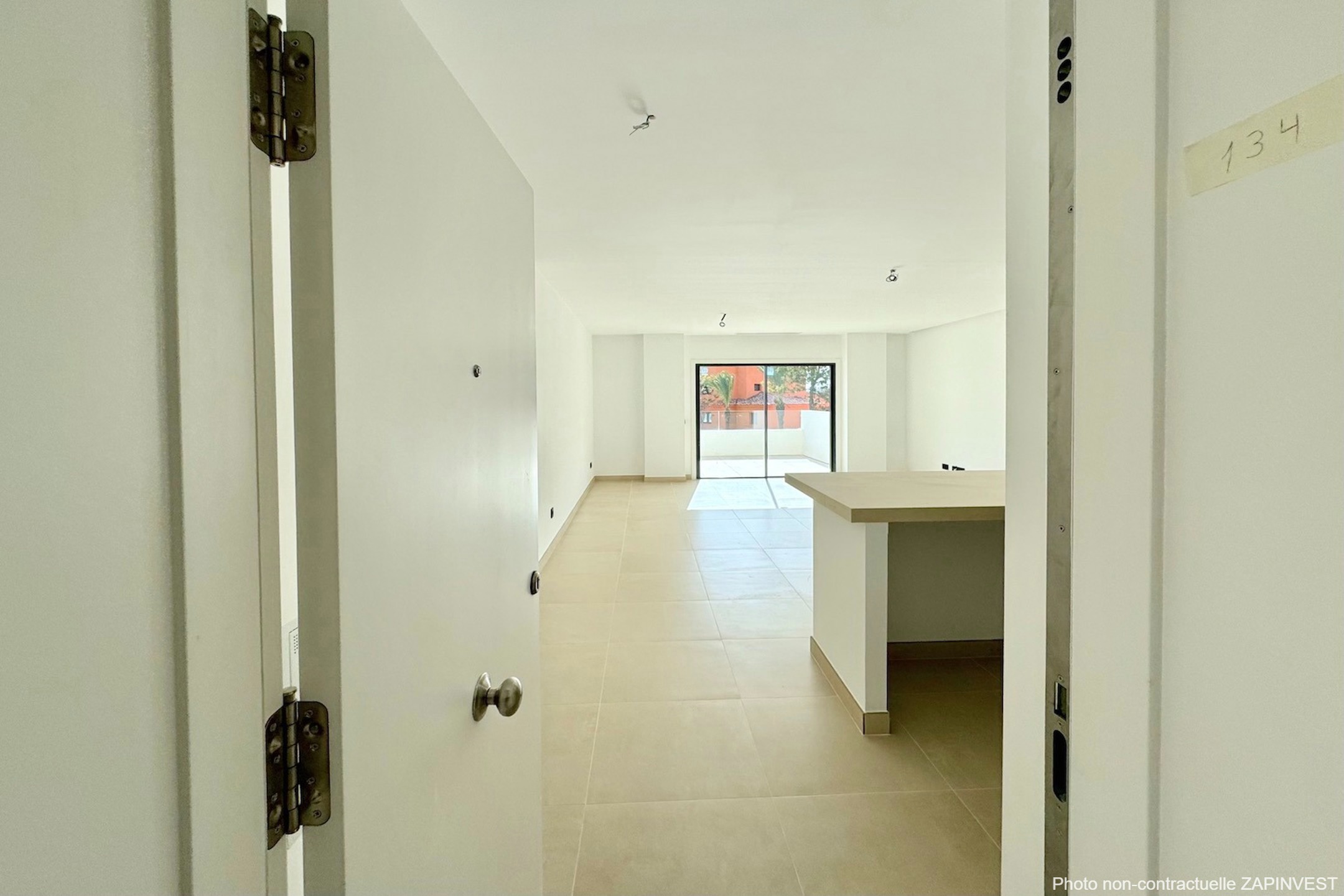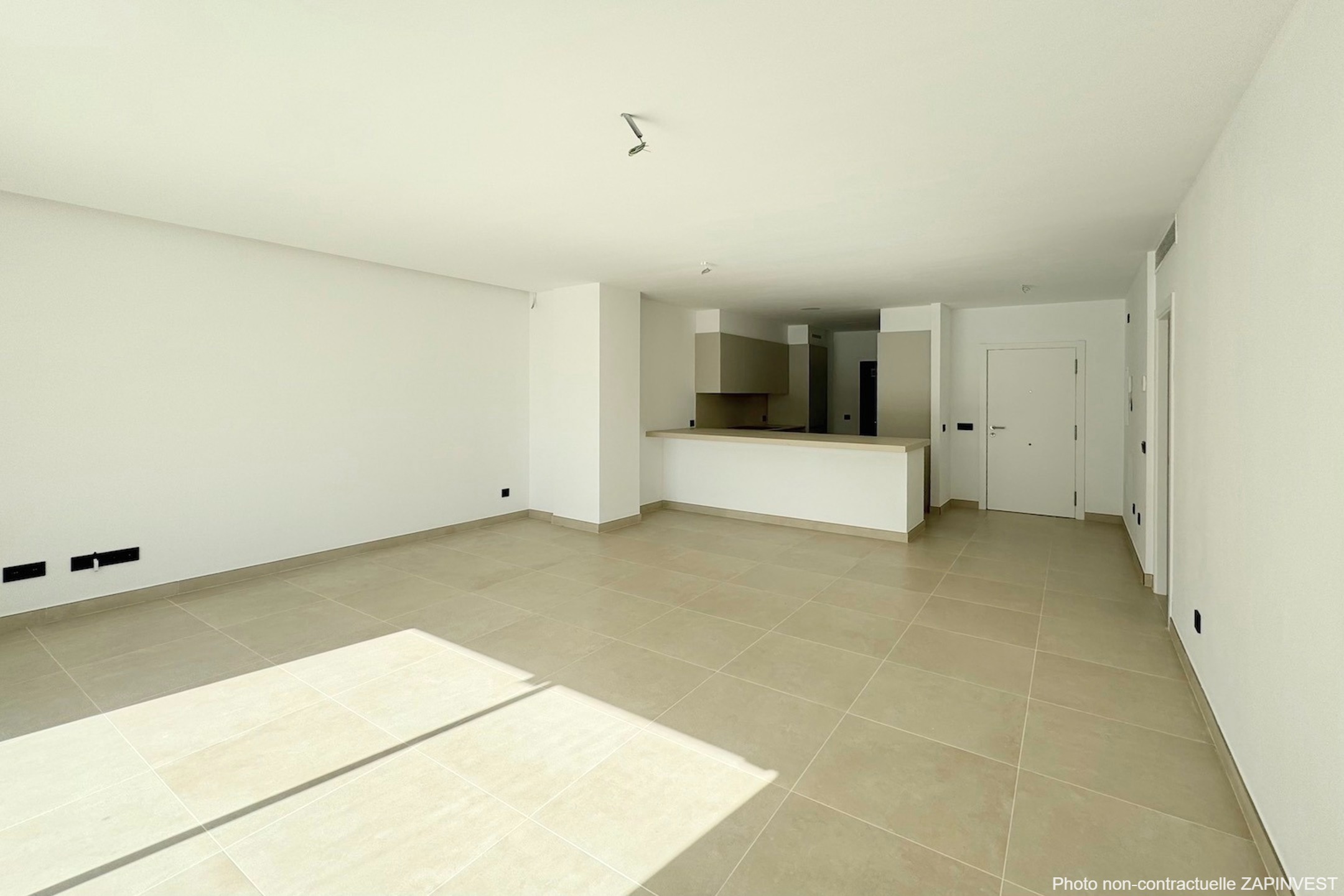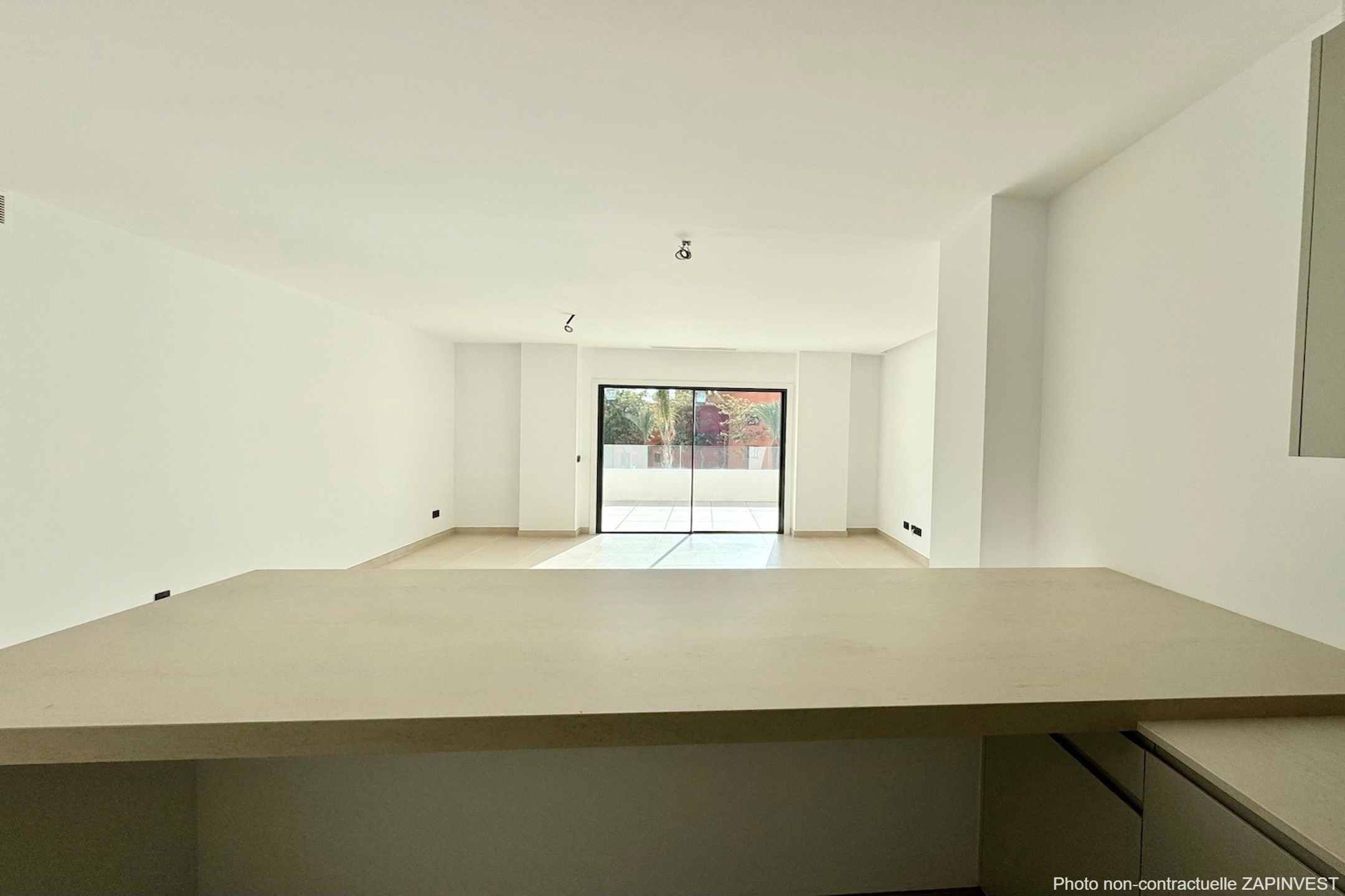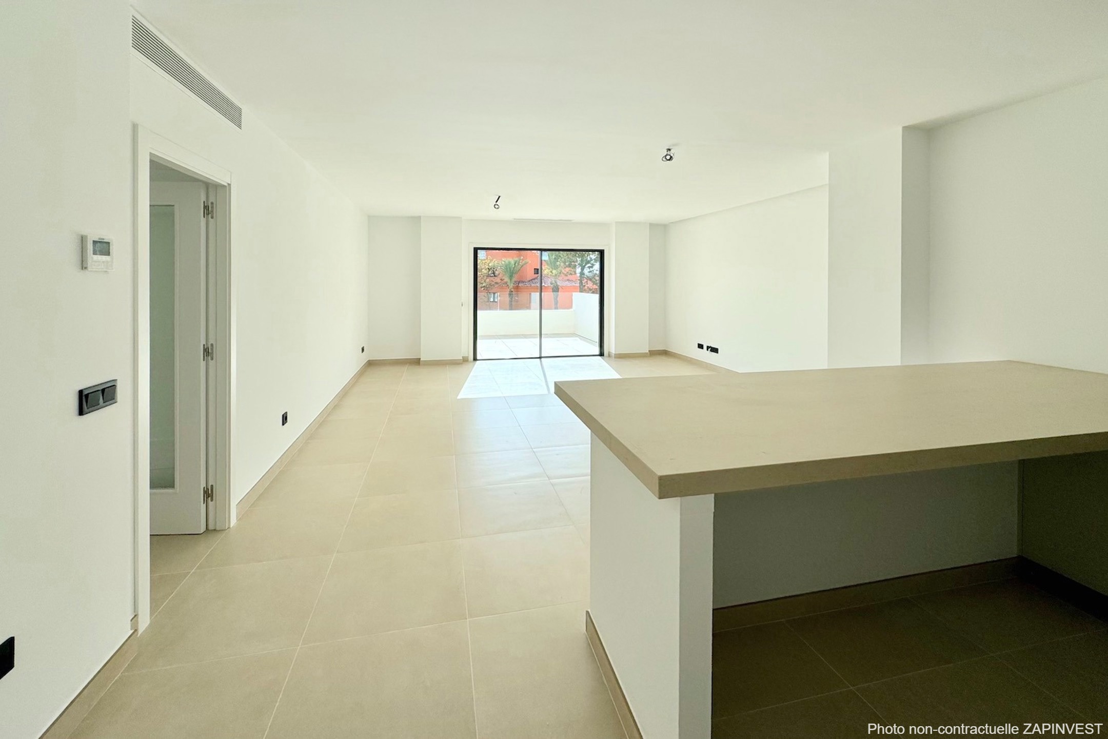 L'entrée de l'appartement se fait directement par la pièce de vie constituée du salon et de la salle à manger qui donne directement sur la terrasse.