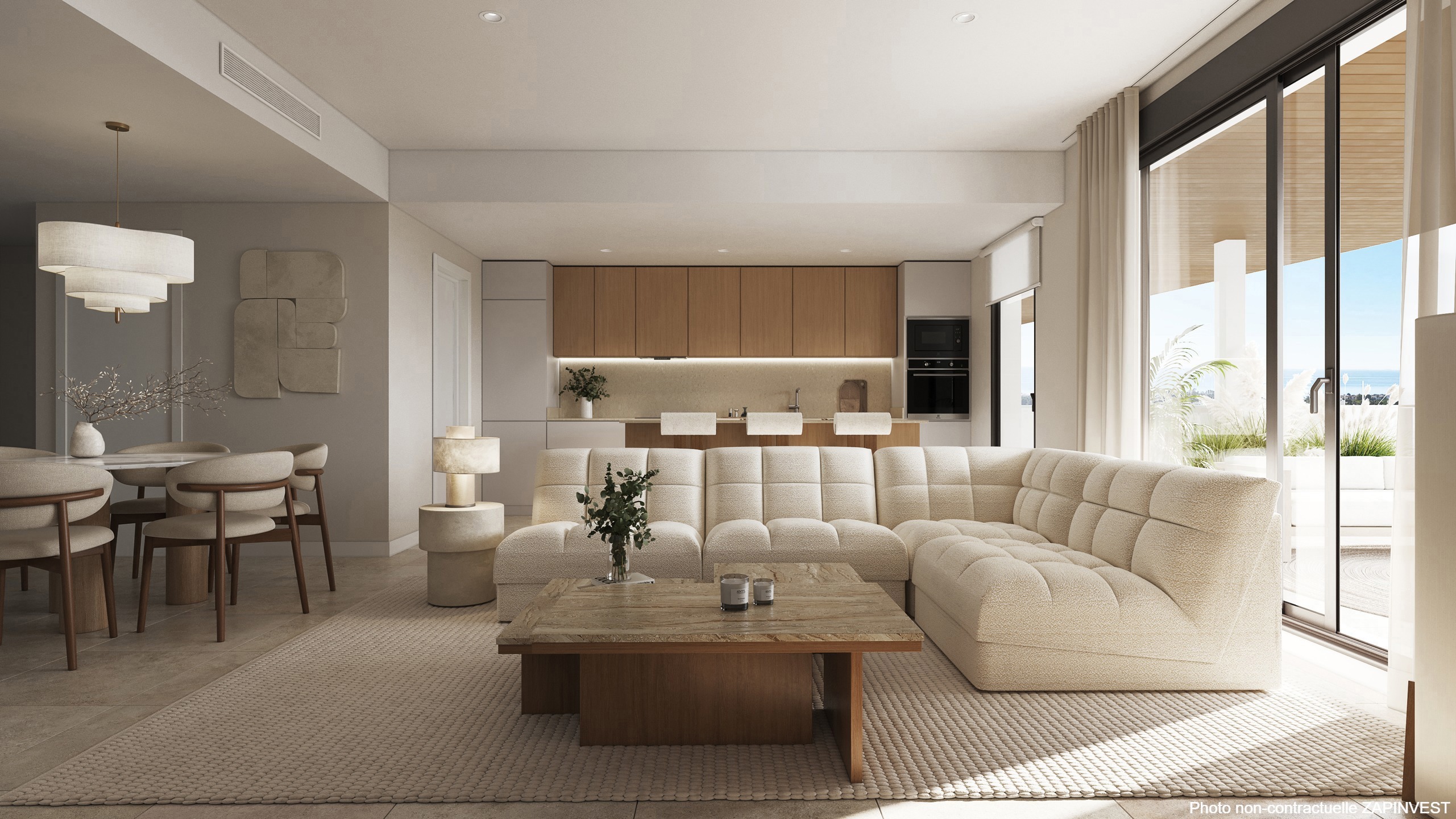 La cuisine sera entièrement équipée avec plaque à induction, hotte aspirante, four électrique et micro-ondes, plan de travail, meubles bas et hauts en quartz compact, évier avec robinetterie mitigeur, lave-vaisselle, réfrigérateur, lave-linge.