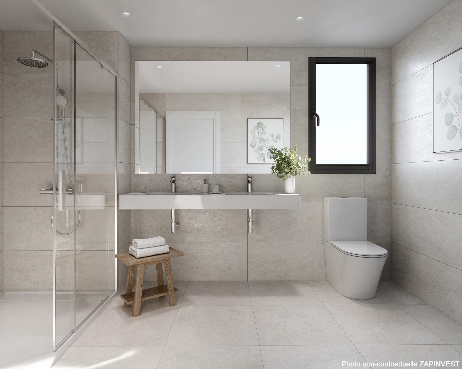 Les salles de bain ont été conçues en choisissant des finitions qui s'intègrent parfaitement au reste de l'appartement. Elles seront équipées d'un plateau de douche en résine, d'une paroi en verre et d'un miroir. Les toilettes auront une finition blanche, et donneront à la pièce un aspect avant-gardiste. La salle de bain principale sera équipée d'un lavabo à double vasque.