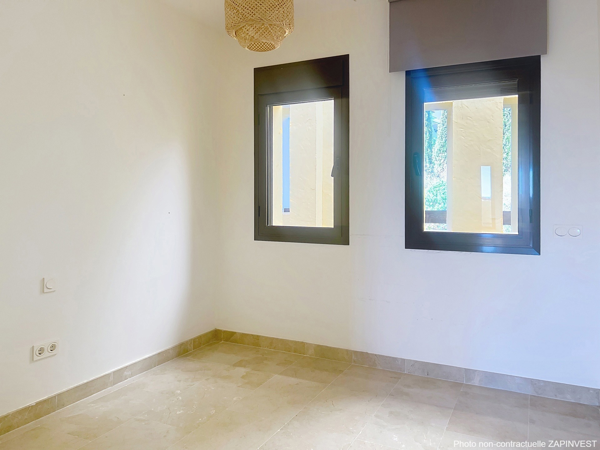 La suite principale dispose de sa propre salle de bain et d’un accès direct à la terrasse avec de magnifiques vues sur la mer et le golf. La seconde chambre, orientée vers les jardins verdoyants de la résidence, est complétée par une salle de bain pour les invités.
