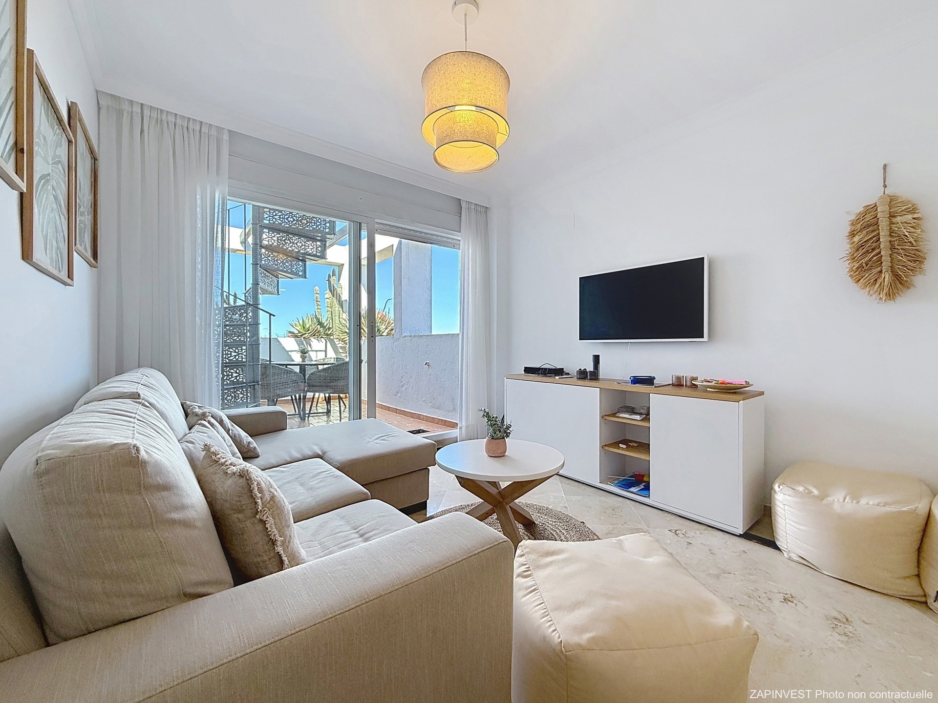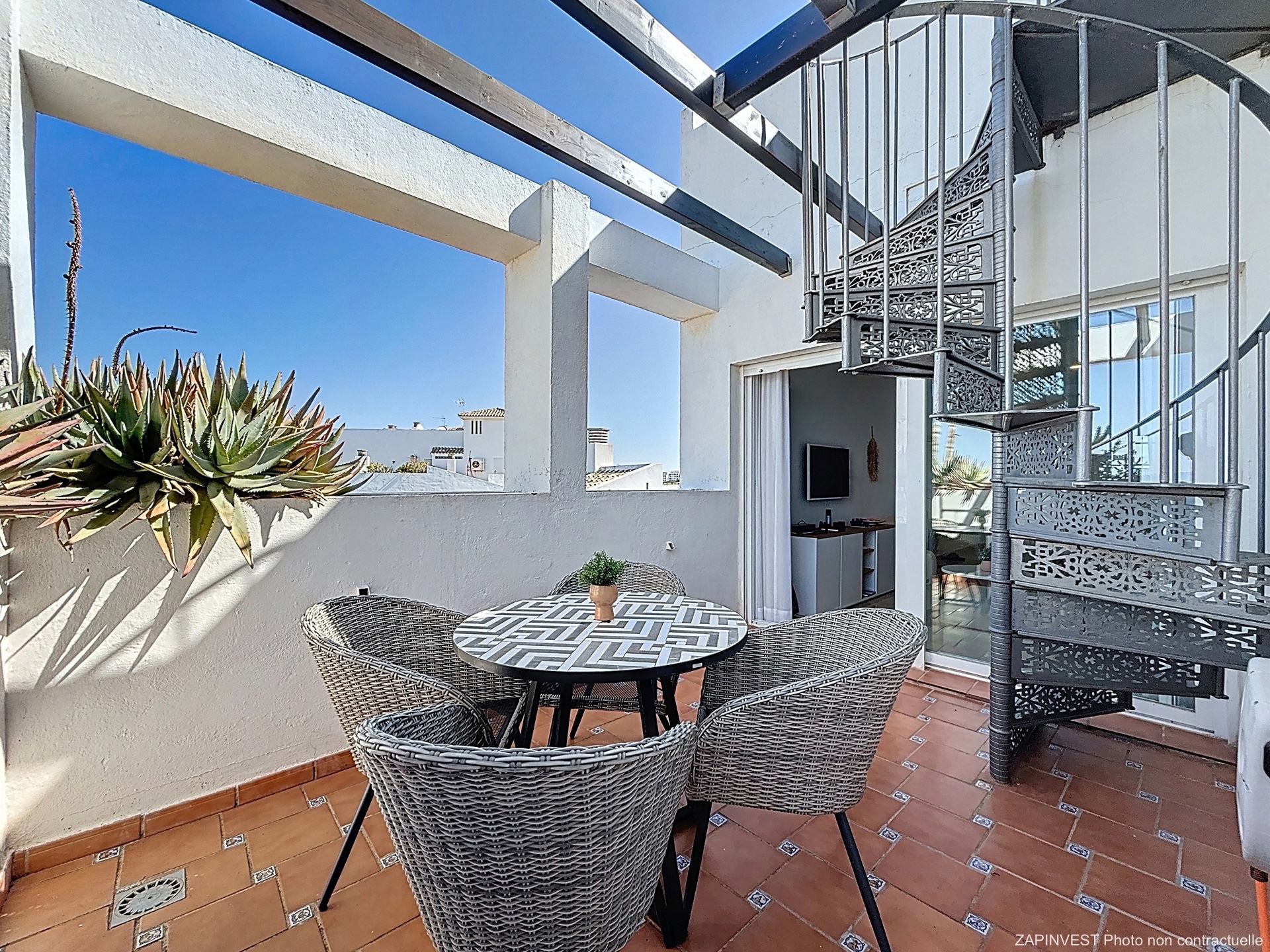 Il se situe au 3ème et dernier étage d'un complexe fermé et sécurisé avec jardin et piscine, et se compose d'un séjour lumineux, d'une cuisine complètement équipée et de deux chambres, dont une suite parentale avec accès direct sur la terrasse principale. Depuis la terrasse principale vous pourrez accéder à votre toit-solarium privatif où vous pourrez vous prélasser tranquillement au soleil tout au long de l'année.
