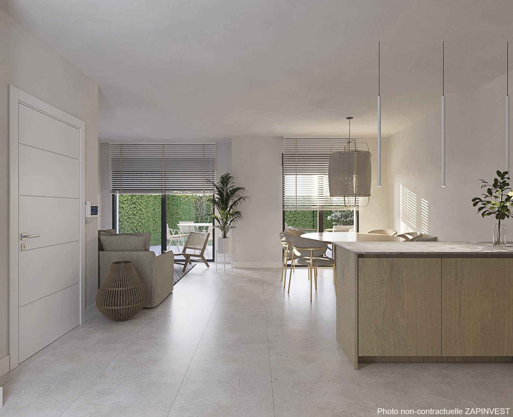 La cuisine est entièrement équipée avec des électroménagers Siemens ou similaire incluant un four, un frigo-congélateur, une taque électrique et sa hotte, un évier et un lave-vaisselle. La pré-installation pour le lave-linge est également prévue.