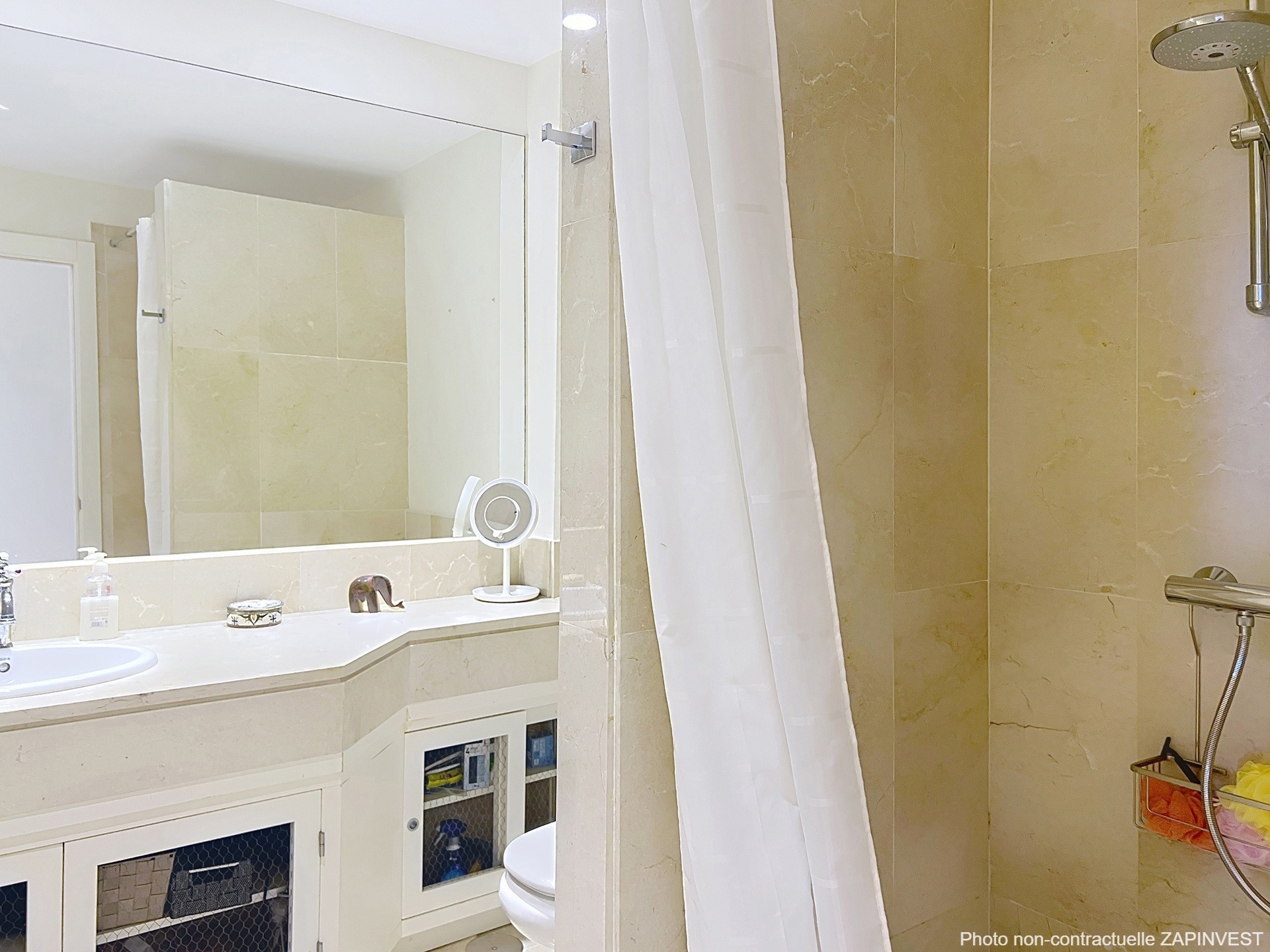 Cet appartement situé au rez-de-chaussée, élevé, offre de grands espaces de vie, 2 chambres et 2 salles de bains en marbre beige de qualité, une cuisine entièrement équipée ouverte sur le salon par un passe-plat.
