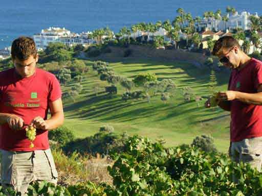 La visite se fait de plus en plus concrète… c’est donc le moment de rejoindre le domaine viticole pour la tant attendue dégustation. L’endroit est fabuleux ! Depuis la plantation, nous avons une vue dégagée sur la côte et toute la région. Sous la pergola, au sommet de la vigne nous attendent quelques tapas, les choses sérieuses peuvent commencer ! Nous dégustons les 3 sortes de vins produits au domaine, à base de raisin Moscatel. Le blanc sec, à la robe claire (le seul qui est commercialisé), un demi-sec (déjà bien sucré, on sent que le soleil à bien fait son ouvrage) à la robe dorée et enfin, un vin sucré, de type cherry de Malaga, à la magnifique robe rousse qui ravit nos papilles.
