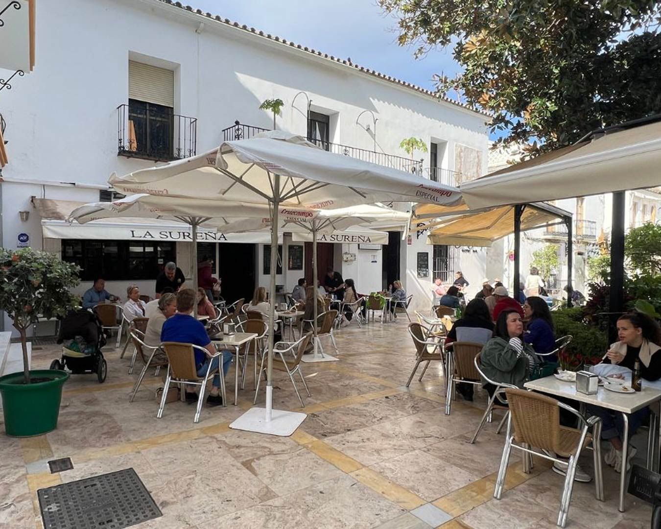 La meilleure façon de résumer La Sureña est sa situation : La Plaza de la Flores, une splendide place traditionnelle, avec ses orangers et autres plantations, une splendide fontaine, ...un lieu amblématique du vieil Estepona. À l'ombre de la végétation à midi ou dans l'ambiance et les éclairages du soir, vous ne pouvez pas être déçus